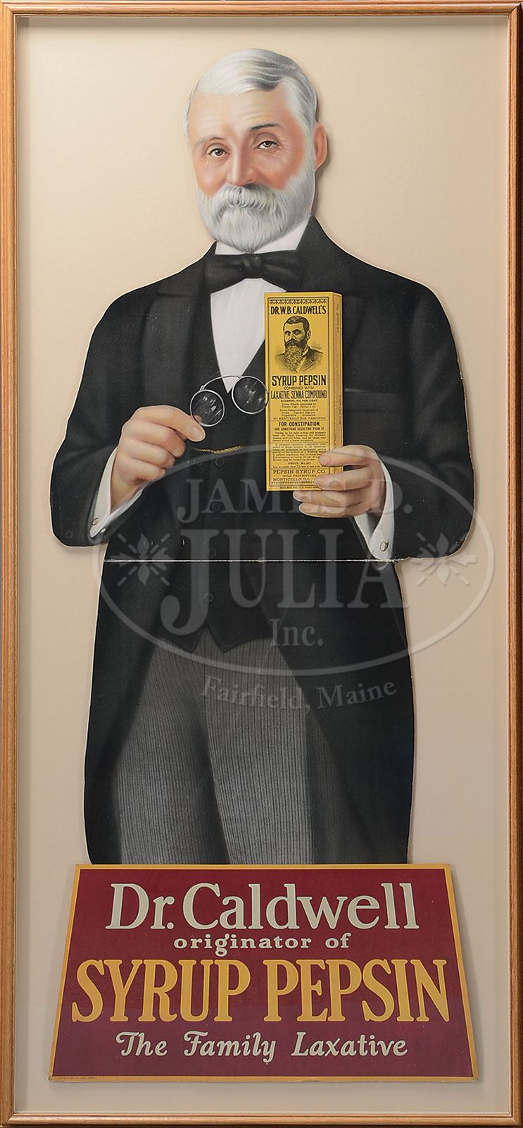 DR. CALDWELL’S SYRUP PEPSIN CARDBOARD DIE CUT STORE FLOOR DISPLAY.Almost life sized cut out of formally attired Dr. Caldwell with a product box of his Syrup Pepsin. SIZE: Image: 24-1/2″ w x 60-1/2″ h. PROVENANCE: The Collection of Richard J. Miller. CONDITION: Near excellent with typical horizontal fold crease. 1-15098 (400-600) – Lot 1585 Auction: Advertising, Toy & Doll Auction - Fall 2014 Please Note: All prices include the hammer price plus the buyer’s premium, which is paid by the buyer as part of the purchase price. The prices noted here after the auction are considered unofficial and do not become official until after the 46th day. |