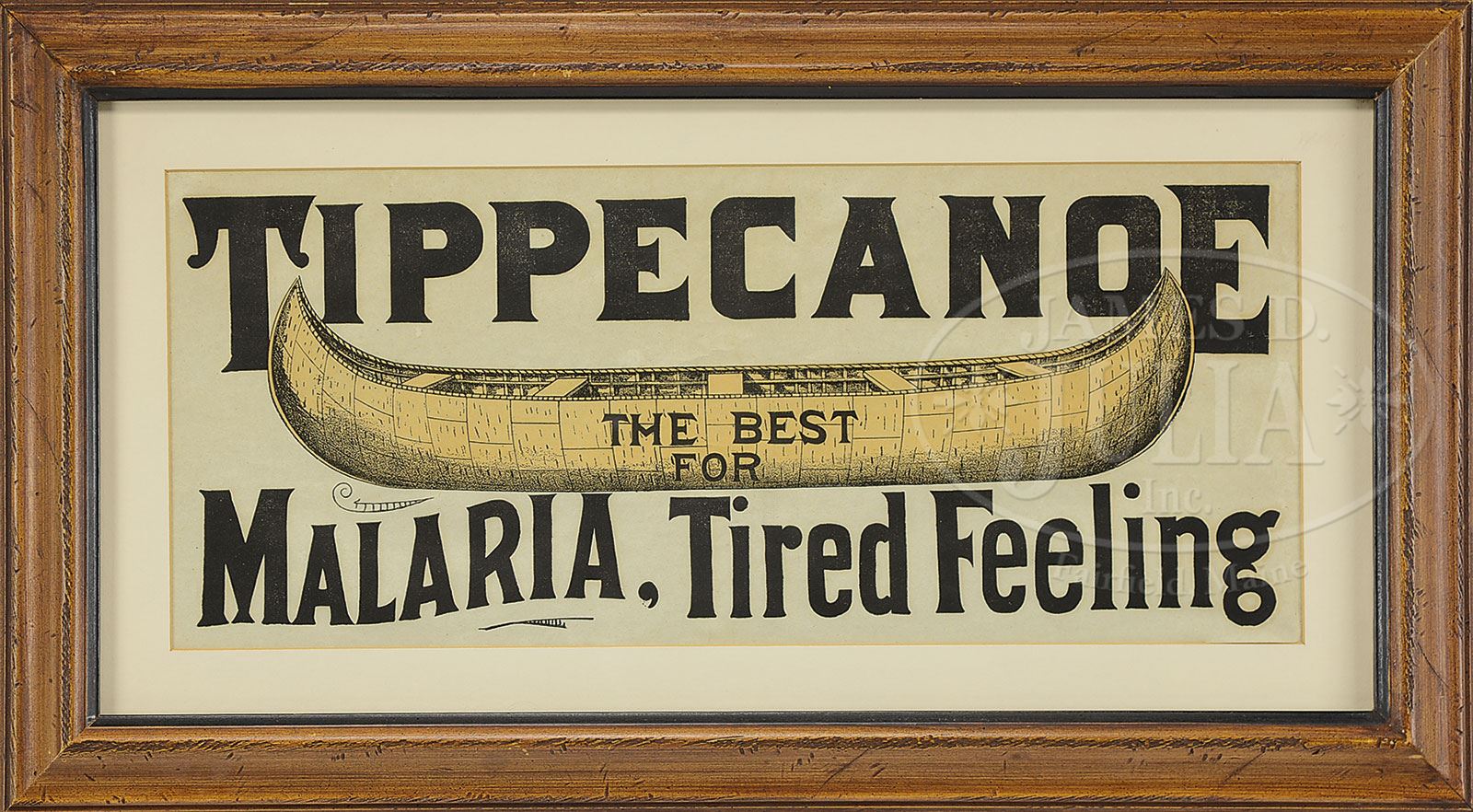 WARNER’S TIPPECANOE BITTERS PAPER SIGN AND BOTTLE.Sign is a play on words, employing a birch bark canoe graphic to promote Tippecanoe Bitters as being the best for “Malaria” and that “Tired Feeling”. Lot also includes bottle with original partial label, embossed with “Tippecanoe – H. H. Warner & Co.” and a canoe. SIZE: Sign image: 20-3/4″ w x 8-3/4″ h. Bottle 9″ h. PROVENANCE: The Collection of Richard J. Miller. CONDITION: Sign is near excellent with small tear far upper left corner. Bottle in near excellent condition without any sickness; retains 80% of the original paper label. 1-15068 (200-400) – Lot 1586 Auction: Advertising, Toy & Doll Auction - Fall 2014 Please Note: All prices include the hammer price plus the buyer’s premium, which is paid by the buyer as part of the purchase price. The prices noted here after the auction are considered unofficial and do not become official until after the 46th day. |