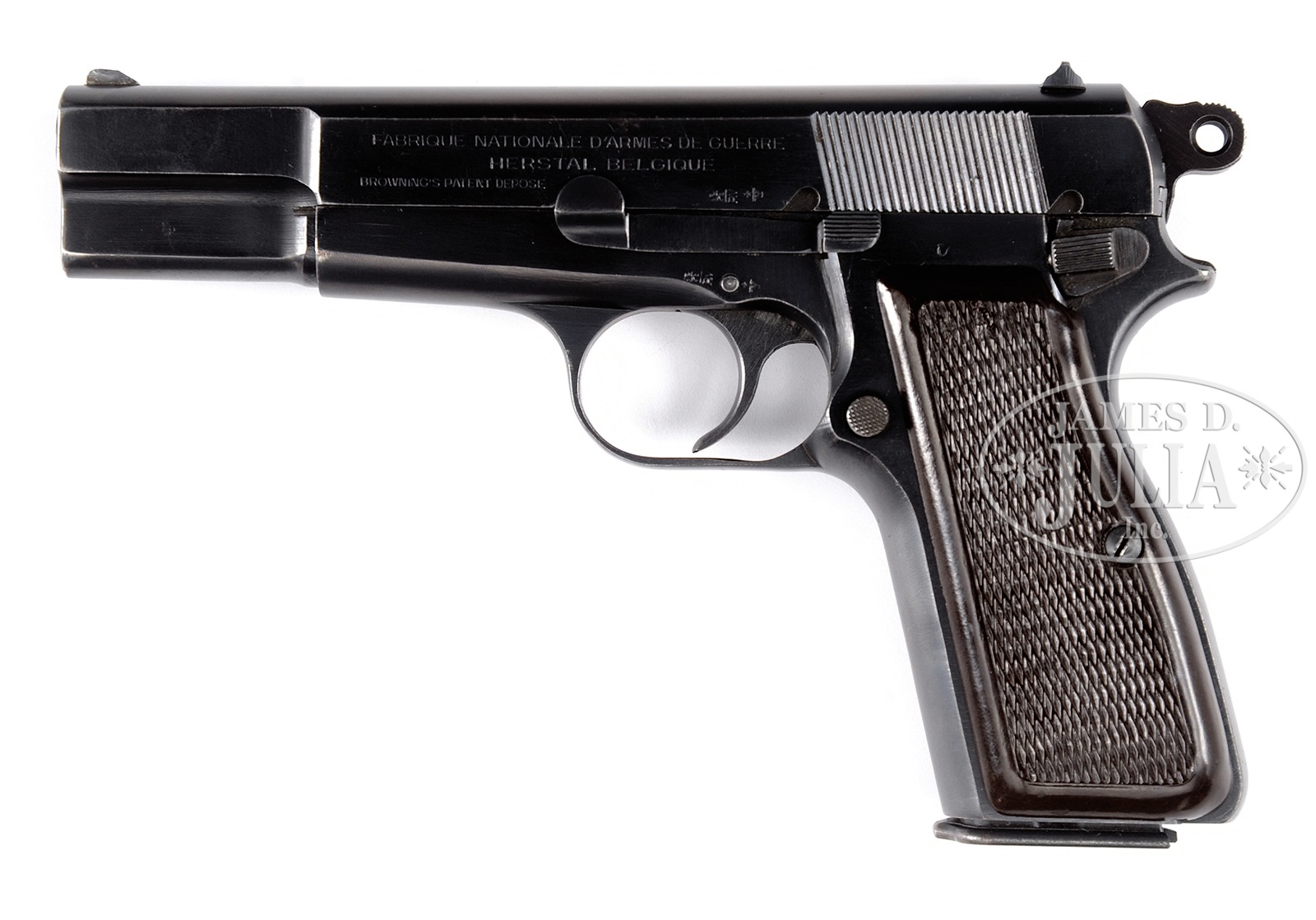 SN A244. Cal. 9mm. Rust blue finish with scarce and correct brown plastic grips. The A prefix of the SN means “Allemand” indicating the gun was assembled from German produced parts by the freed Belgians upon their liberation. These are very uncommon and normally in hard used condition. Matching numbers throughout with proper unmarked magazine with milled base and aluminum follower. CONDITION: Exceptionally fine overall condition, with extremely minor muzzle wear and finish loss at high points of slide and a very minor trace of finish loss on frontstrap from apparent holster use. Backstrap has similar wear point at extreme bottom of grip. Brown plastic grips are excellent with no breaks, cracks or material loss whatsoever which is rarely found because they did not hold up well. Bore and mechanics are exceptional. A very scarce Belgian High Power. 51028-1 TDW (1,000-1,800) C&R – Lot 1587