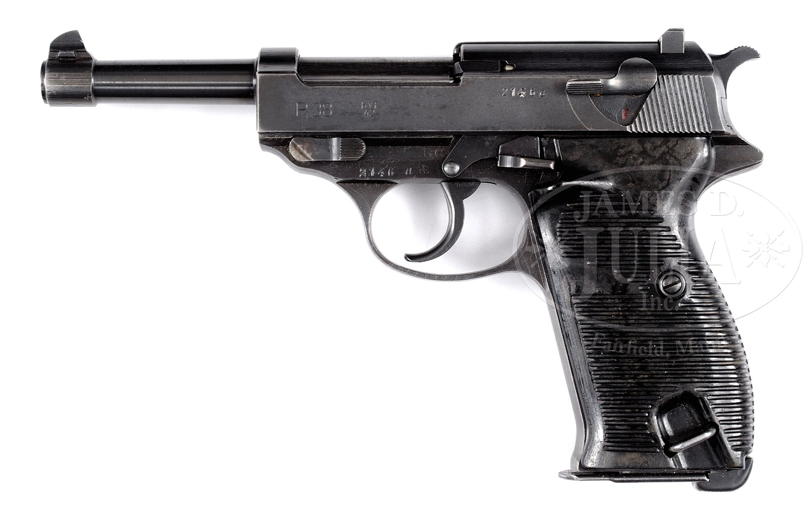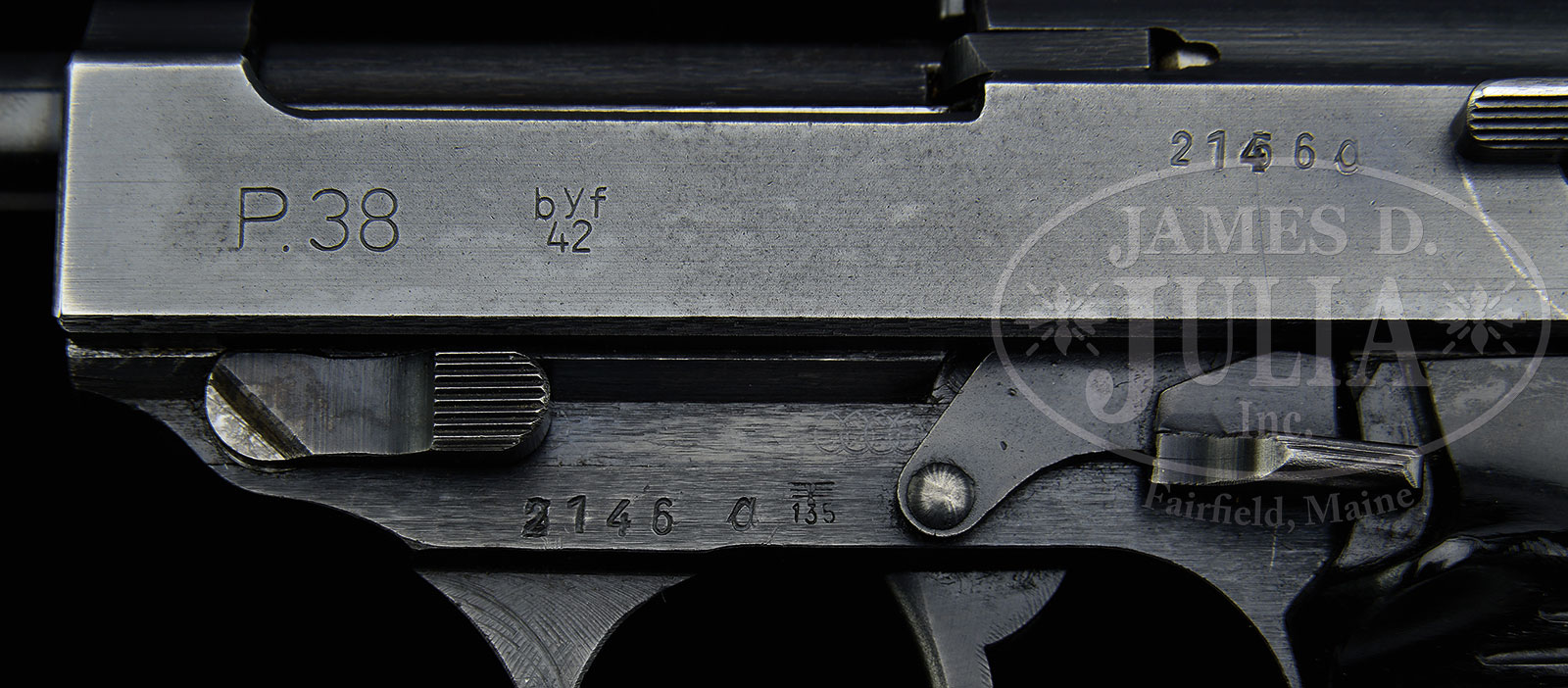 *FINE MAUSER “BYF’ CODE P.38 PISTOL DATED 42.SN 2146a. Cal. 9mm. 5″ bbl dull blue finish slide with matching frame and military polish barrel. Matching numbers through out. Stack Date “BYF over 42”. Correct brownish Bakelite 2 piece grips. Waffen 135 inspection found slide barrel frame and locking lug. Early “a” series stack date P.38 pistols are difficult to find in fine condition as they were relatively early war and hard used. CONDITION: Very fine overall with excellent bright shiny bore and crisp action. Finish, although showing slight minimal wear, is very fine. Front strap finish is worn thin with about 50% remaining. Frame has slight finish wear at forward edges of and surrounding take down latch. Typical finish loss from holster carry but a fine honest example of a Stack Date 42 Mauser. 51221-3 TDW (1,000-2,000) C&R – Lot 1587