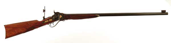 *”THE SHARPS CREEDMOOR” RIFLE. SN SCR058. Cal. .45-70, 32″ oct. bbl. This commemorative was made for US distributors by Pedersoli in Italy. Action is engraved with a gold enhanced buffalo on the right side of the receiver and lockplate and a standing moose on the left side of the receiver. Wood is checkered. Equipped with a peep sight and globe front sight and dbl set triggers. CONDITION: Appears to be unused but has minor handling marks. FS851 4-47092 (1,250-2,500)