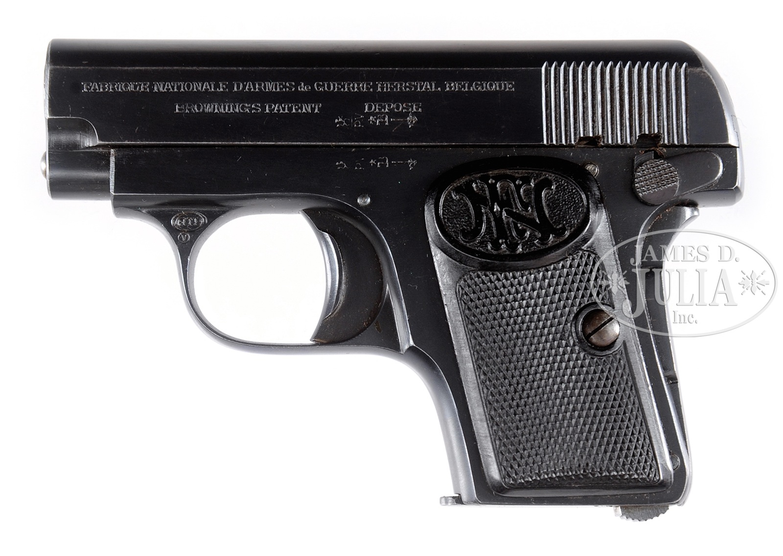 *FN BROWNING POCKET .25 WITH BOX.SN 583172. Cal. 6.35. 2-1/4″ bbl. Blue finish overall with “FN” monogrammed black plastic grips, with numbers matching commercial “FN” box, instruction manual and cleaning rod. PROVENANCE: The Charles Copeland, Jr. Collection. CONDITION: As new with virtually all orig rust blue remaining, with only slightest traces of edge wear on corners of slide. Bore and mechanics are as new. Box is complete with broken corners, and slight loss on one end. 50823-31 TDW (750-1,250) C&R – Lot 1591