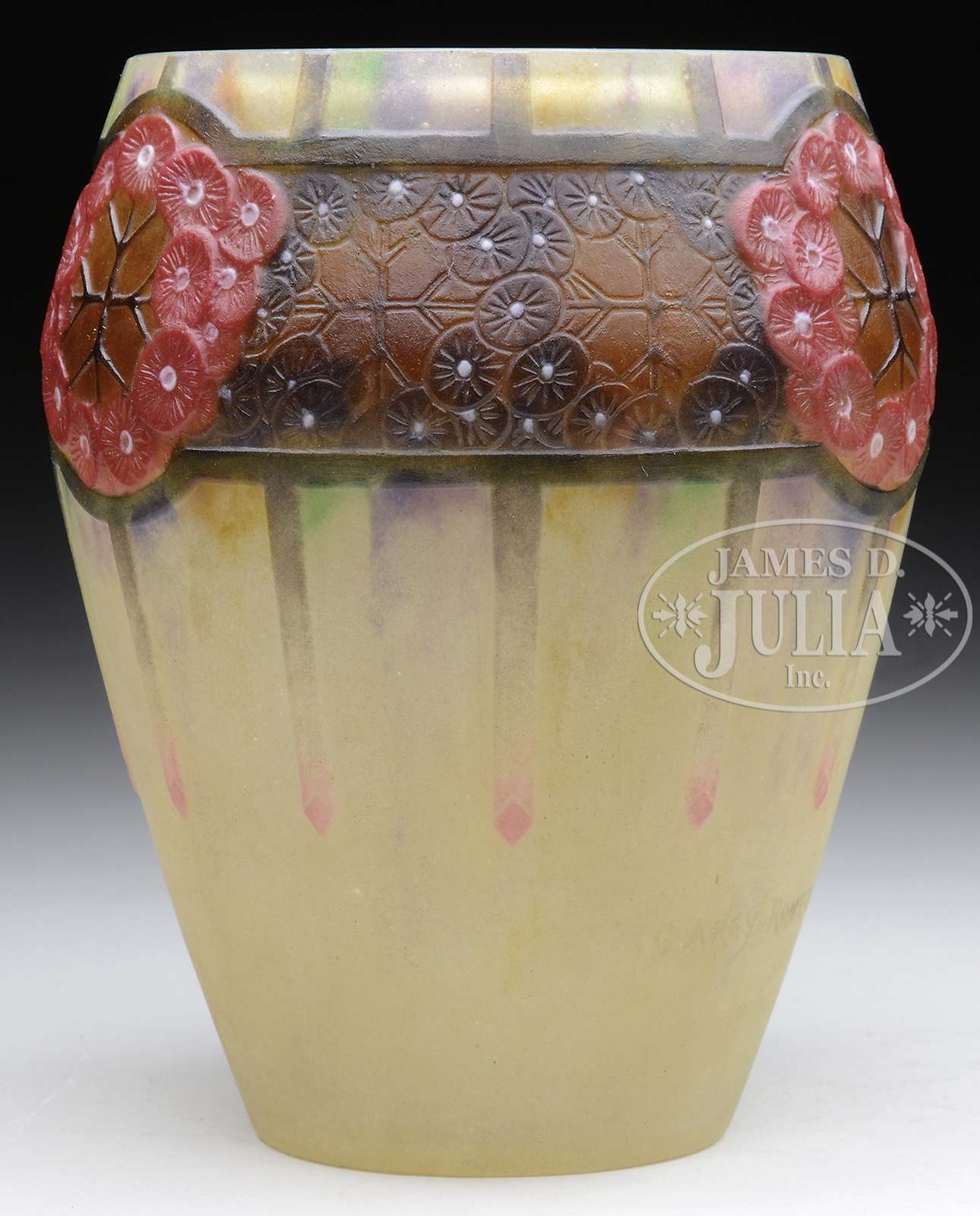 GABRIEL ARGY ROUSSEAU UMBELS VASE.G. Argy Rousseau pate de verre vase in the Umbels pattern has red and brown stylized flowers in a band surrounding the shoulder of the vase with a trellis background all set against a frosted yellow background. Signed on the side with impressed signature “G. Argy Rousseau”. Vase picture in the book G. Argy Rousseau Glassware as Art by Janine Bloch-Dermant page 191, photo 23.04. SIZE: 7-3/8″ t. CONDITION: Very good to excellent. 48966-3 (6,000-8,000) – Lot 1592