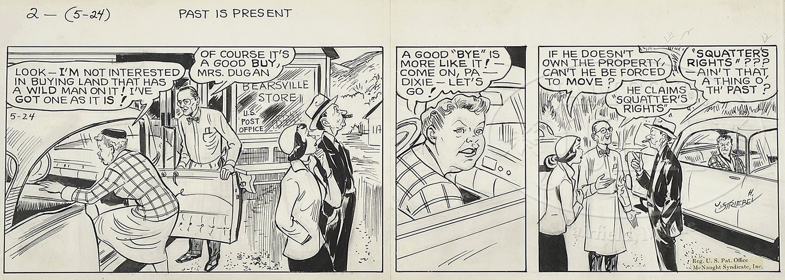 JOHN H. STRIEBEL (American, 1892-1962) FOUR DIXIE DUGAN ORIGINAL CARTOONS. Pen and ink on hard stock Housed: One in red metal frame with white matte; another in white matte; two are unframed All are signed “J. H. Striebel” SIZE: 1) 14″ x 16″. Overall: 18″ x 20″. 2) 10-3/4″ x 9-3/4″. Overall: 16-1/2″ x 15-1/4″. 3 & 4) 6-1/2″ x 19″. PROVENANCE: From a Maine home acquired from a family member of the artist CONDITION: Framed example has yellow toning, otherwise very good. 9-29771 (200-400)