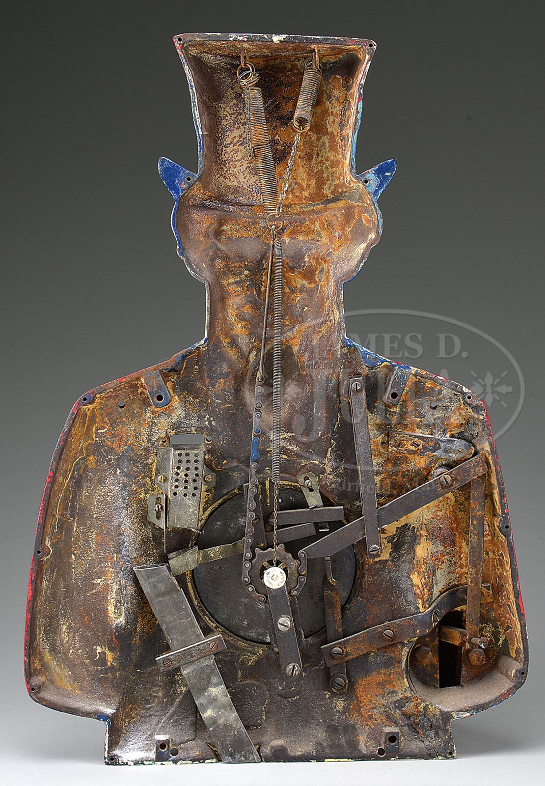 UNCLE SAM STRENGTH TESTER TOP.A classic arcade machine with tremendous appeal. Only a partial machine, the consignors enjoyed the aesthetics of this piece and had it handing on their wall in their house for many years. Originally the large iron casting was mounted to a wooden pedestal base with claw feet & placed in arcades and/or other locations for use. The concept being, for a penny, how hard could I squeeze Uncle Sam’s hand, and a dial would register your efforts. Originally manufactured by two companies, Caille and Exhibit Supply Co., there were two slightly different versions/cabinet styles. This particular machine, or part of, is an original casting with a fair amount of the mechanism still present. It is an old repaint, probably 30-40 years ago and is currently on Free Play. SIZE: Approx 28″ t. PROVENANCE: The Collection of Richard J. Miller. CONDITION: As stated above, old repaint, lacking plaque over coin entry area, newer paper behind dial. 1-14988 (600-1,200) – Lot 1593 Auction: Advertising, Toy & Doll Auction - Fall 2014 Please Note: All prices include the hammer price plus the buyer’s premium, which is paid by the buyer as part of the purchase price. The prices noted here after the auction are considered unofficial and do not become official until after the 46th day. |