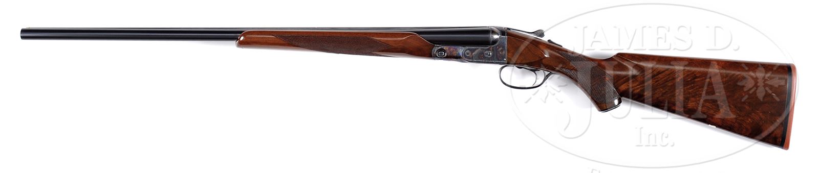 *PARKER VHE.SN 236568. Cal. 20 ga. 26″ Vulcan steel bbls, 3″ chambers. Choked: IMP CYL/MOD. Full length matted rib with twin white plastic beads. Parker single selective trigger, automatic ejectors, non-automatic safety. Capped full pistol grip buttstock with 14-7/16″ LOP over “Old English” Pachmayr pad. Beautiful flamed grained American walnut buttstock with nickel shield, checkered in two point pattern. Beavertail forend with Deeley release, checkered in three point pattern. Receiver is zig zag border engraved and marked “Parker” on bottom of frame. Weight: 7 lbs. 1 oz. CONDITION: Extremely fine as refurbished. Bbls and trigger guard retain nearly all of their restored blue finish. Receiver in cyanide case color retains nearly 100%. Buttstock and forend with scattered light handling marks and scratches retain most of their custom hand rubbed finish, with a minute grain check in forend near frame. Mechanics are excellent, bores are bright and shiny. 49417-64 JSL194 C&R (3,500-5,500) – Lot 1596