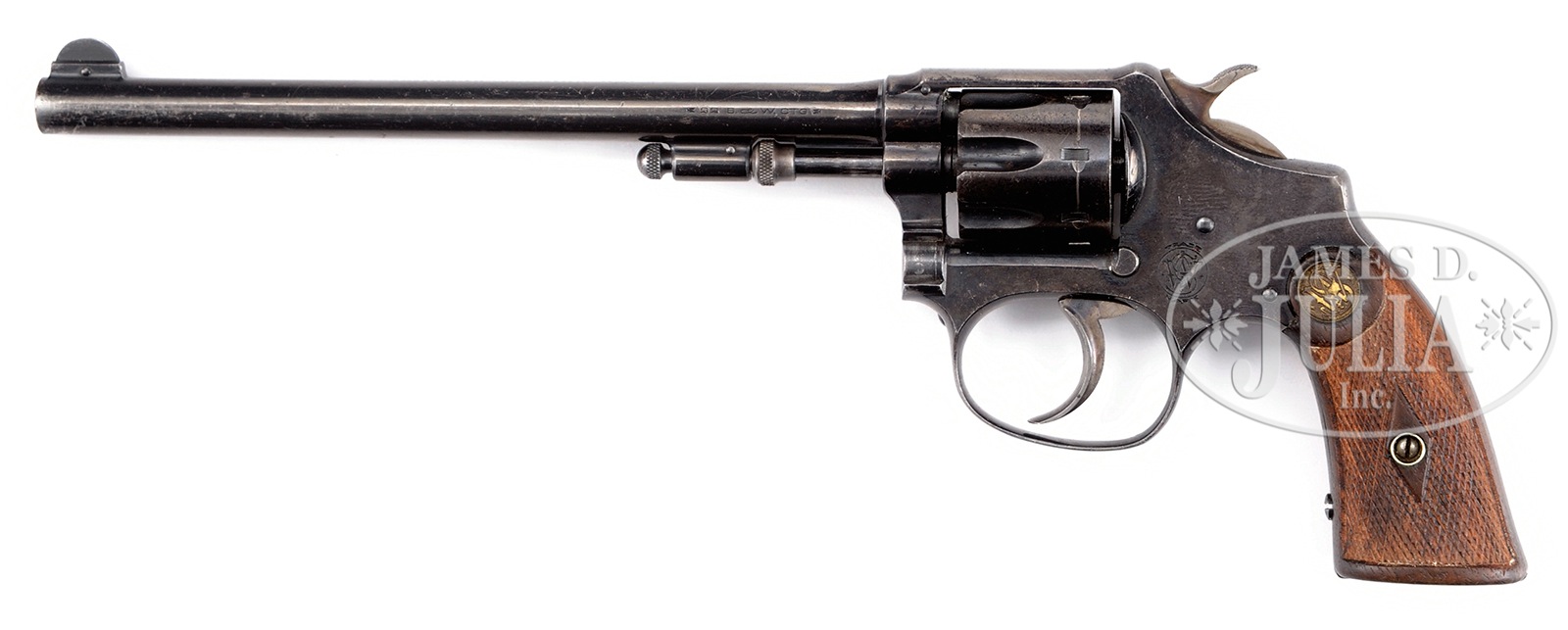 *EXCEPTIONALLY FINE SMITH & WESSON LADY SMITH THIRD MODEL REVOLVER.SN 16084. Cal. 22. 6″ bbl. Blue finish overall with case colored trigger and hammer. Pinned fixed front and rear sight. Square butt frame with 2-pc checkered walnut grips with gold deep dish medallions. 7-shot cyl with hand ejector extraction. PROVENANCE: Estate Collection of Jim Baldwin. CONDITION: Exceptionally fine example with most blue finish remaining with thinning on cyl and finish loss on bbl towards muzzle as well as backstrap and front strap of grips. Typical light finish loss at high points and crowns of frame. Bore is exceptionally fine with good mechanics. Most case color remains on hammer and trigger with slight loss on sides from use. Grips are very good with evidence of having checkering been chased in an attempt to clean them lightly. Very fine gold grip medallions. A far above average 6″ Lady Smith revolver. 50975-10 TDW (1,750-2,250) C&R – Lot 1598