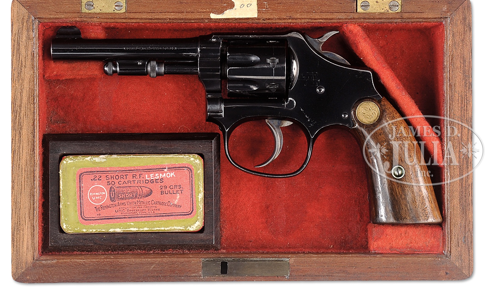 SN 22456. Cal. 22. 3-1/2″ bbl. Blue finish overall with smooth walnut grips with gold deep dish medallions. Case colored hammer and trigger. 7-shot cyl with hand ejector extraction. Fixed front and rear sights, square butt frame. Accompanied by an exceptionally high quality, well fitting wood casing with red cotton linen lining that appears to be of the period. PROVENANCE: Estate Collection of Jim Baldwin. CONDITION: Exceptionally fine with retention of virtually all blue finish with extremely minor edge wear and one small area of finish loss on side of cyl. Most all vivid case colors remain on hammer and trigger and smooth Smith & Wesson grips are quite excellent with most varnish and exceptional gold deep dish medallions. Matching SN’s throughout inclusive of grips. Superb bore and mechanics. A very exceptional Lady smith. Period casing is very fine with very minor shrinkage cracks in top with excellent and tight corners and base, a minor water mark appears on top if rolled into a proper lighting. Hinges lock and spine are excellent. A small tray has been added for the storage of ammunition and includes 1 sealed box of UMC .22 short Less Smoke cartridges in its orig rounded corner box with exceptionally fine label and seal. 50975-2 TDW (1,250-1,750) C&R – Lot 1599
