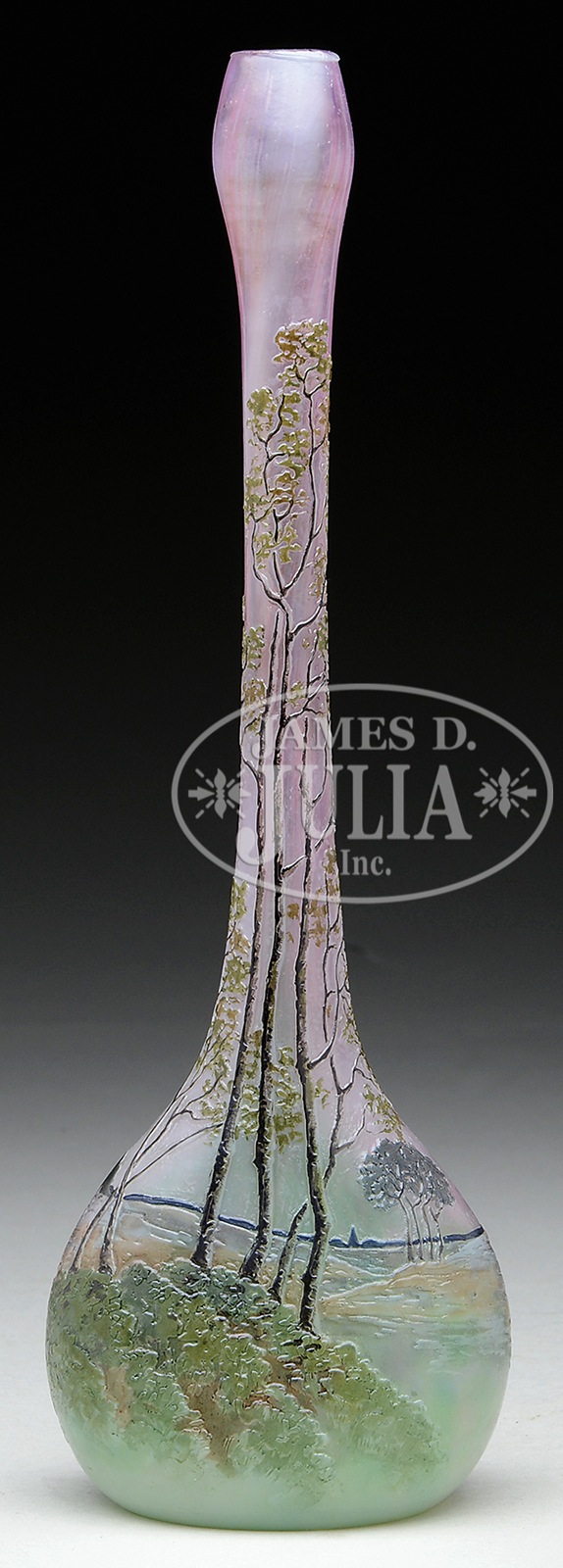 LEGRAS CAMEO AND ENAMELED VASE.Legras vase has flat sided bulbous body with tall slender neck. Vase is decorated with cameo trees extending from alongside pond. Pond shows green, amber and purple ripples. Trees are nicely enameled with brown trunks and green foliage. All set against a shaded pink background. Signed on back “Legras”. SIZE: 10-3/4″ t. CONDITION: Very good to excellent. 49808-25 (500-800) – Lot 1603
