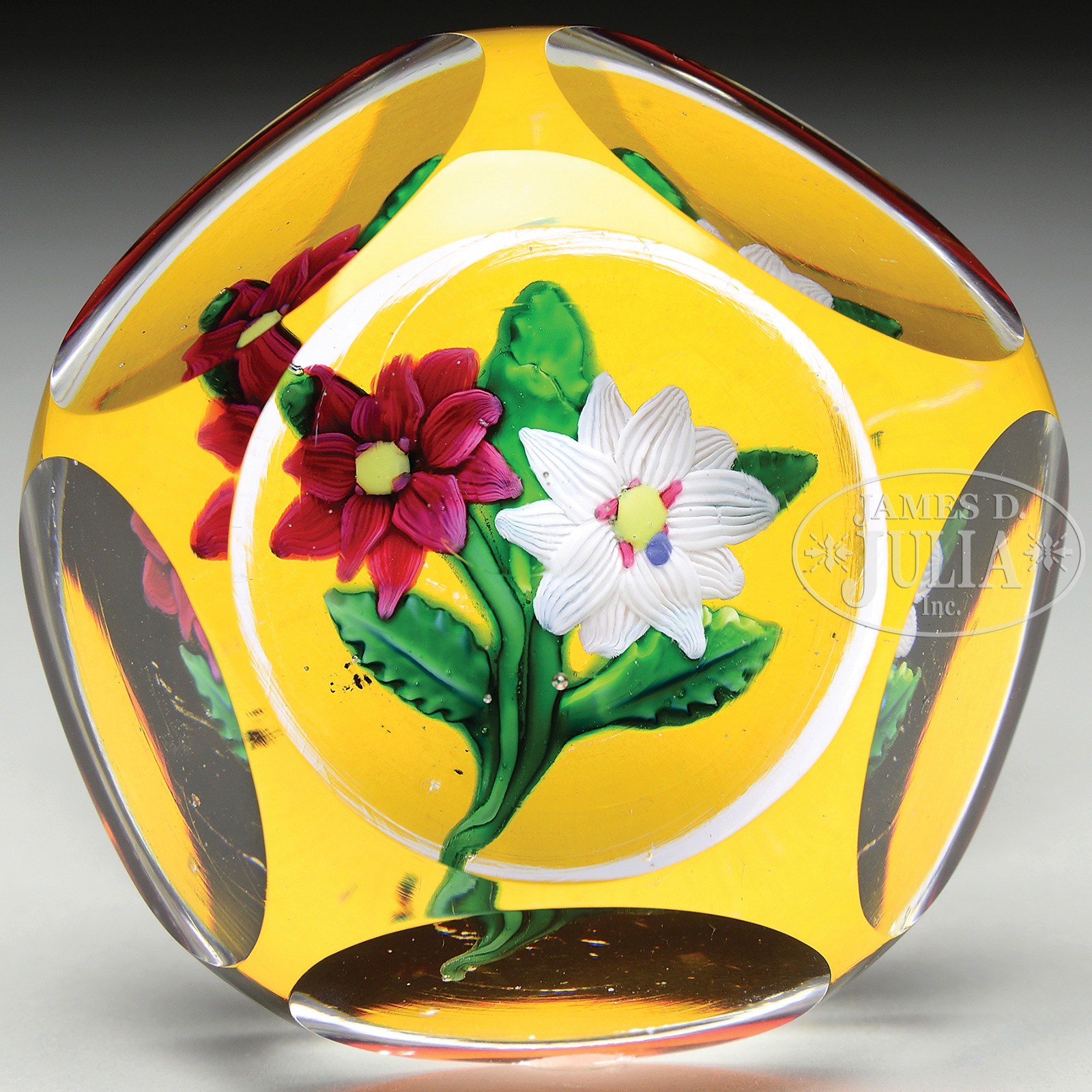 ST. LOUIS FLASHED PAPERWEIGHT.Rare St. Louis paperweight has flashed amber glass bottom. The paperweight has five faceted windows on the side and a single round faceted window on top revealing a red and a white clematis with shaded green leaves and stems. SIZE: 2-1/2″ dia. PROVENANCE: Ex-Maurice Lindon Collection. CONDITION: Very good to excellent. 5-67868 (8,000-10,000) – Lot 1604