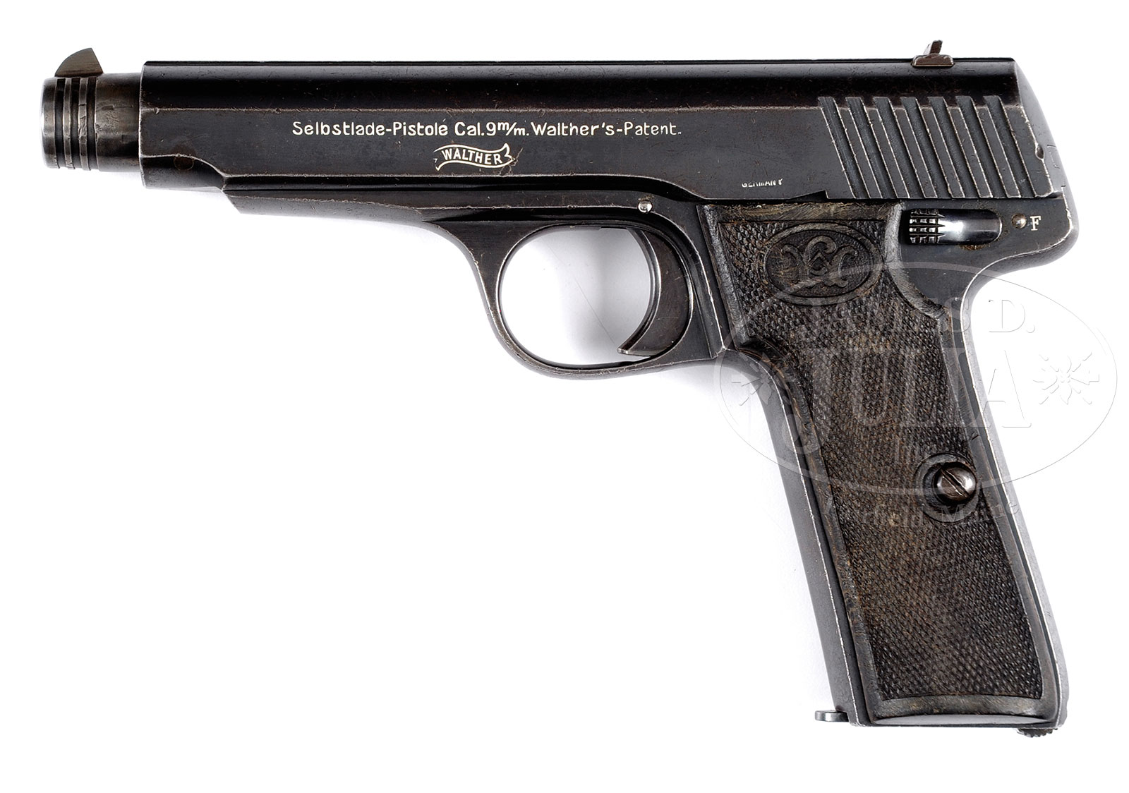 *LARGE AND IMPRESSIVE WALTHER MODEL 6 PISTOL.SN 1015. Cal. 9mmp. Standard configuration Walther Model 6, single action blowback pistol, with 4.75″ bbl, fixed front sight and drift adjustable rear sight. The left side of matching slide is marked with a single line legend “Selbstlade-Pistol Cal 9 m/m. Walther’s-Patent” over Walther banner. Further back is “GERMANY”, in small letters, as applied to pistols made for export. Right side of slide marked “Carl Walther, Waffenfabrik, Zella St. Bl.”. C/N proofing over the exposed chamber and immediately below on the slide and frame. SN “1015” on the right upper trigger guard. Hard rubber grip panels each with an encircled C/W at the upper portion. Elsewhere checkered with a generous border and secured with a single screw. Unmarked, re-blued replacement magazine with eight indicator holes. Orig rust blue finish that has been applied to all major and most minor parts except the fire-blued extractor and the grip screws. The most desirable and largest of the numbered Walthers whose production was limited to about 1,000 pistols, this example being one of the last Model 6s completed by Walther. PROVENANCE: The Esteemed Collection Of Noted Expert And Author Warren Buxton. CONDITION: Approximately 70-80% orig rust blue with fine scratches and uniform wear as one might expect from moderately hard use. There is more wear on the bbl bushing, now partially polished and with a number of small mars, retaining about 30% orig blue. Grip panels are faded with diamond blunting but no significant chips or losses. Replacement magazine retains most of its re-blue. Bright bore with strong rifling. Perfect manual mechanics. The perfect Walther for a collector who wants a Model 6 but doesn’t want to mortgage his house. 51568-49 LMA (5,000-8,000) C&R – Lot 1606
