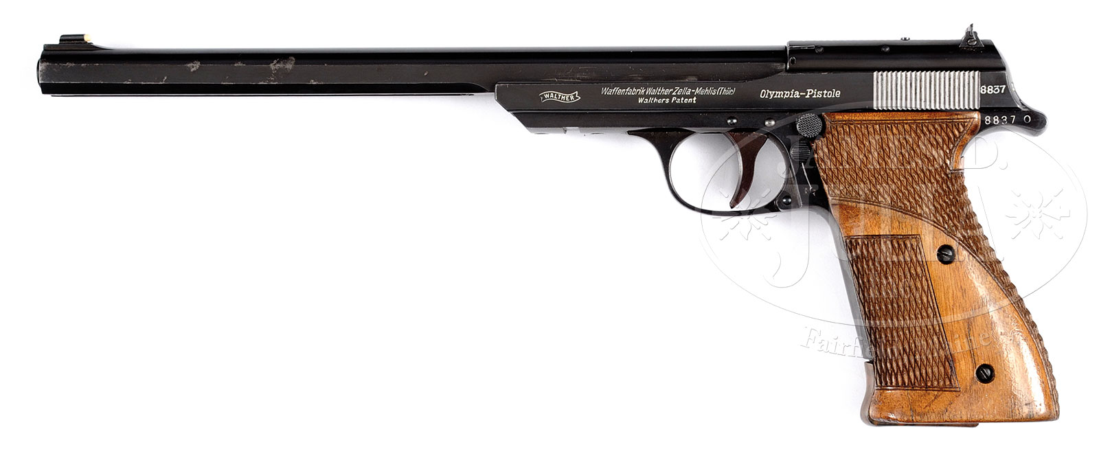 *WALTHER 1936 OLYMPIA PISTOL, PENTATHALON MODEL WITH LONG BARREL.SN 8837-0. Cal. 22LR. Scarce Walther Olympia pistol, sometimes referenced as the “Funfkampf” or “Pentathlon Pistol” in .22 LR with 9-1/2″ bbl fitted with bead front sight and horizontally adjustable rear sight. The left side of the slide is marked with the Walther banner, its location Zella-Mehlis, “Olympia-Pistole” and the SN “8837” that is repeated immediately below on the extended tang along with “0” for Olympia. The right side of the slide is marked “CAL .22 long rifle”. Eagle/N markings are on the right side of the slide and repeated twice on the right side of the bbl near the chamber. As per all the long bbl’d Olympia’s, the lower surface of the bbl is grooved for a counterweight assembly. The forward frame has a similar provision as reflected by a groove and two screw holes. 2-piece wrap-around wooden grip secured with two screws and covered with several panels of deep checkering. Mag is fitted to an unmarked hollow base of brown mottled plastic. PROVENANCE: The Esteemed Collection Of Noted Expert And Author Warren Buxton. CONDITION: Approximately 90% orig salt blue finish with the left side of the bbl having several spots of noticable discoloration. Crisp walnut grips retain most of their orig varnish with superficial dings. A small crack on the left panel extends about 1/2″ vertically from the base. Bright bore with sharp rifling. Perfect manual mechanics. 51568-10 LMA (1,500-2,250) C&R – Lot 1608