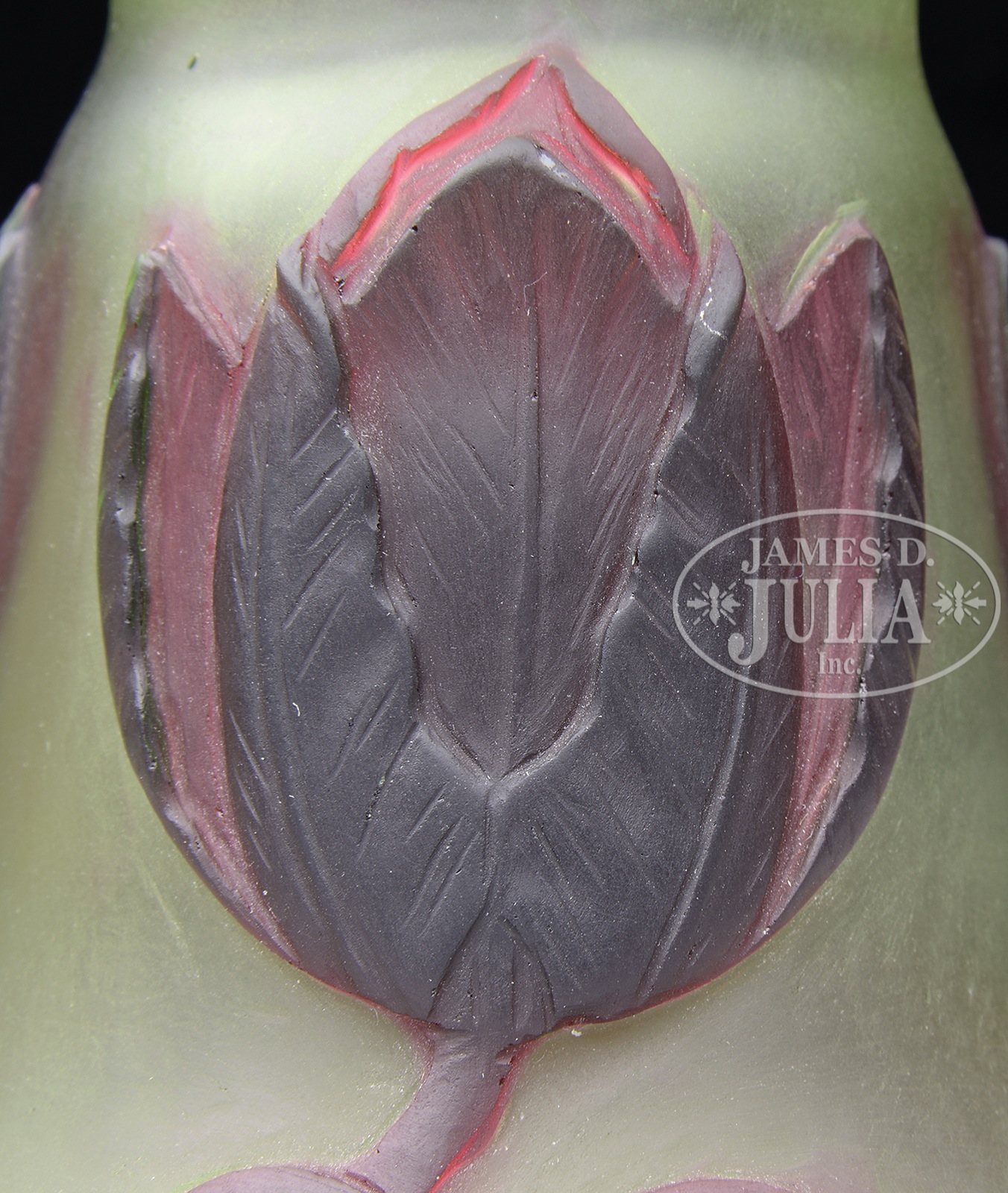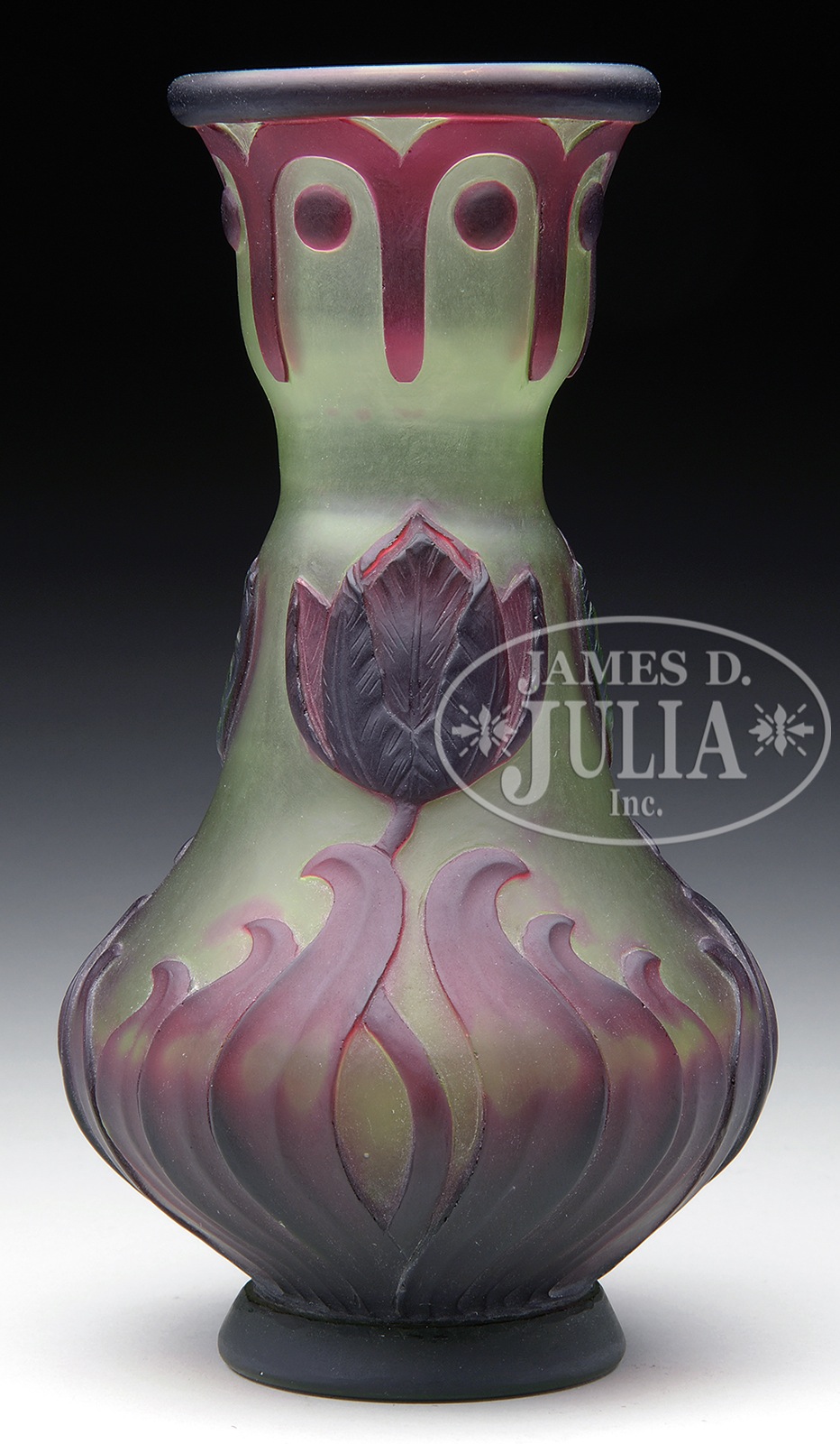 E MICHEL CAMEO VASE.E. Michel vase has deeply carved cameo tulips encircling the vase against a light green frosted body. Vase is further decorated with loops and dots surrounding the lip. Signed on the underside with etched script signature “E. Michel”. SIZE: 8-1/4″ t. CONDITION: There are some tiny flea bites to the edges of some of the tulip leaves and tulip petals, otherwise very good to excellent. 48966-5 (8,000-12,000) – Lot 1609