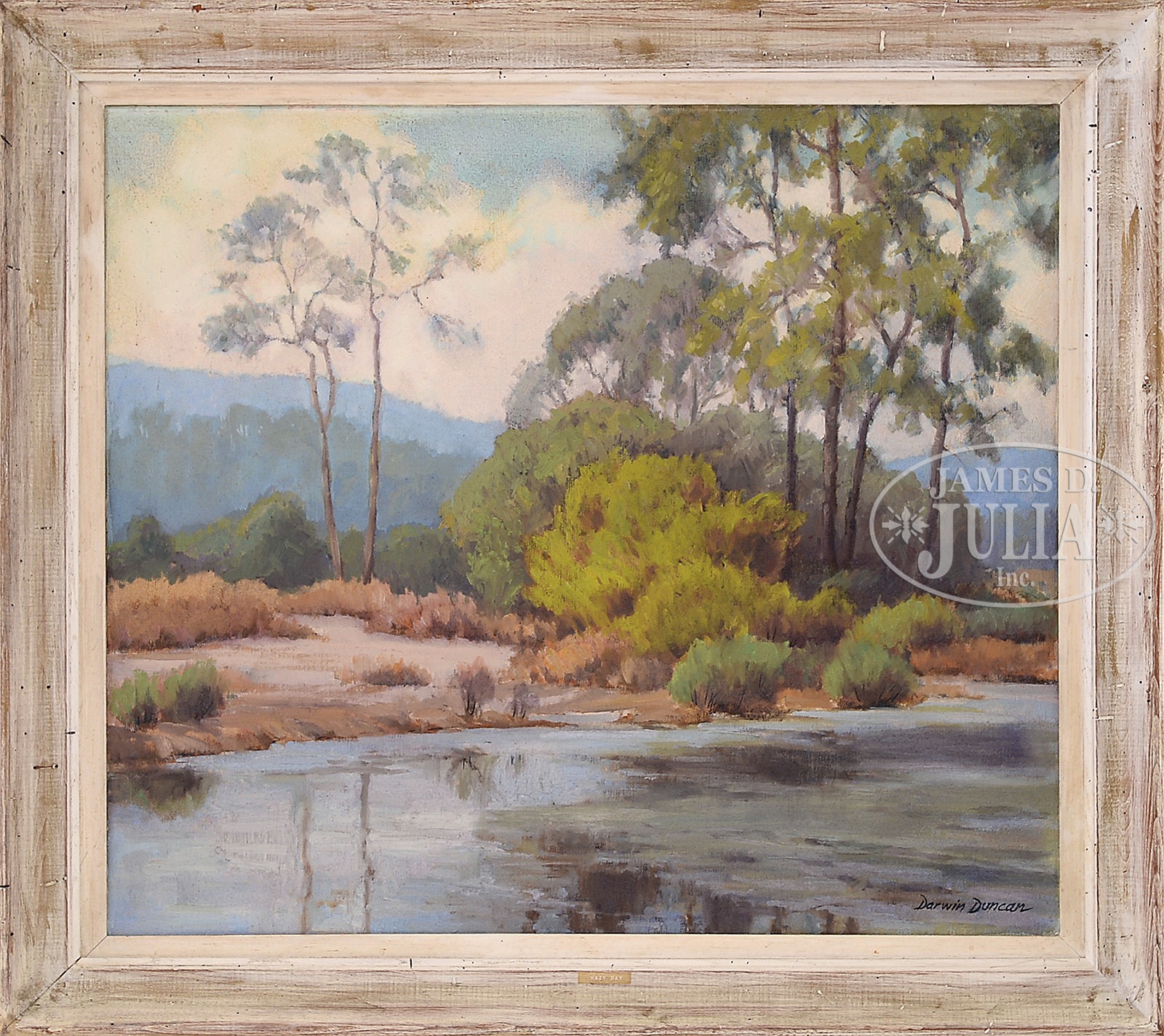 DARWIN DUNCAN (American, 1905-2002) “HAZY DAY”, CALIFORNIA LANDSCAPE.Oil on canvas Housed in a white washed wood frame. Signed lower right “Darwin Duncan”, titled on verso cardboard backing “Hazy Day” SIZE: 28″ x 32″. Overall: 34″ x 38″ CONDITION: Good overall condition, discolored varnish and surface dirt upper left corner. 50391-2 (800-1,200) – Lot 1610