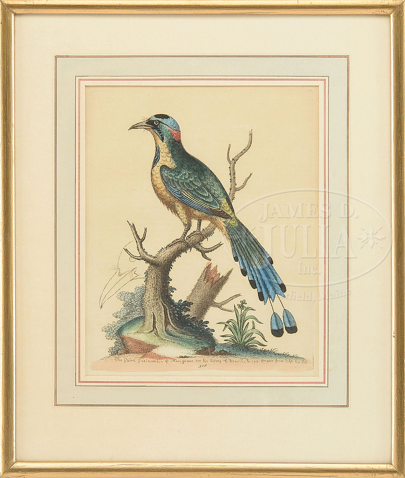 AFTER GEORGE EDWARDS (United Kingdom, 1694-1773) TWO WORKS OF BIRDS. Colored engravings Housed in identical gilt frames with watercolor highlighted mattes Signed & identified in plate SIZE: Sight: 9-1/2″ x 7-1/2″. Overall: 15-3/4″ x 13-1/4″ CONDITION: Light toning, very good, not examined out of frames 7-70548 (800-1,200)