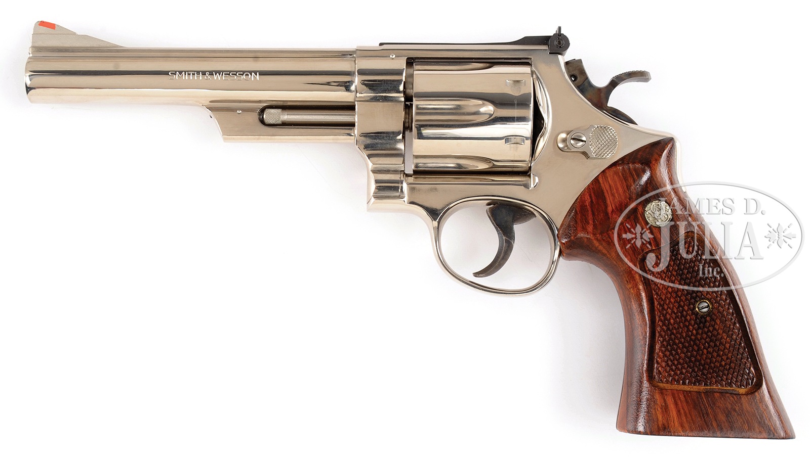 SN N682550. Cal. 44 Mag. 6″ bbl with rib. Orange insert serrated ramp front sight with white outline adjustable rear sight. Case colored target hammer and target trigger. 3-screw action with pin bbl. Full nickel finish. Checkered 2-pc goncalo alves target grips. PROVENANCE: Gerard Ruth Collection. CONDITION: Near new retaining excellent nickel finish showing slight cyl drag line. Very good bore. Very good grips. 51036-25 DS (1,500-2,500) – Lot 1611