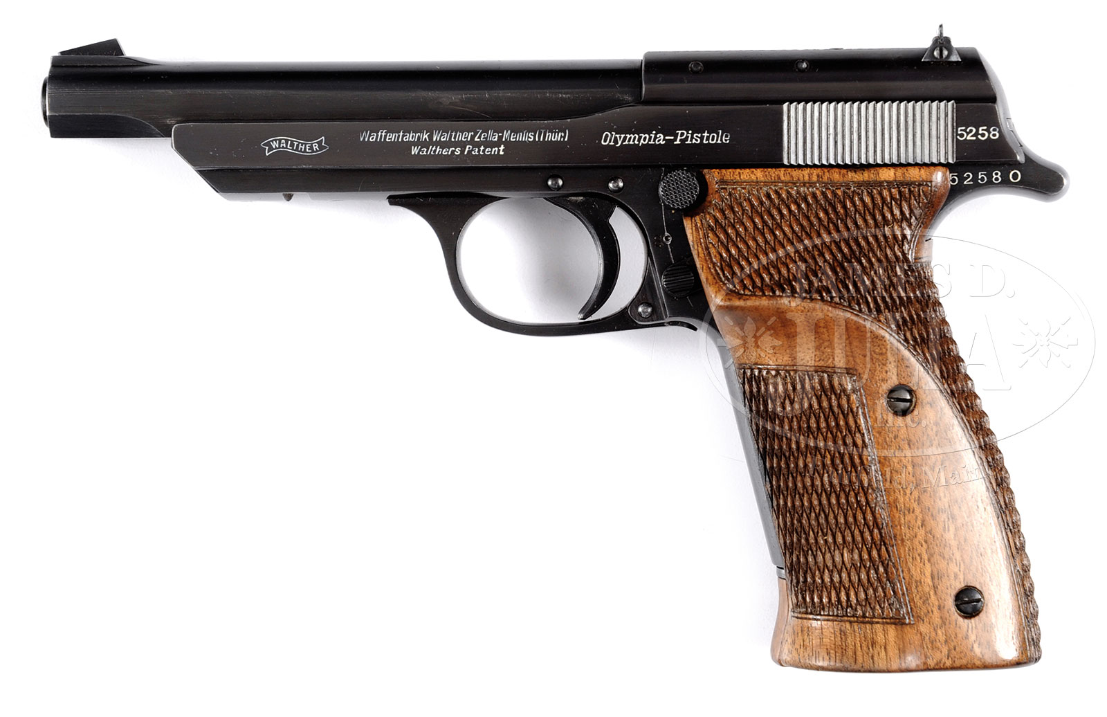 *DESIRABLE OLYMPIA PISTOL, JAEGER MODEL, IN AN ORIGINAL SHIPPING BOX.SN 5258-0. Cal. .22LR. Walther Jaeger Model with 4-5/8″ bbl in pre-war Walther banner OP shipping box. Standard configuration Walther Jaeger pistol with 4-5/8″ bbl having screw-in front sight and horizontally adjustable rear sight. Left side of slide with Walther banner followed by 2-line Zella-Mehlis address followed by “OLYMPIA-PISTOLE” SN at rear of slide is repeated on left tang and suffixed with an “O” (Olympia). Right side of slide is marked with a “Crown/N” that is twice repeated around the chamber area. On the right side of the slide “CAL .22 long rifle”. Unlike the full size Olympia pistols, there is no groove under the bbl, though the standard frame remains grooved and drilled with two holes for counter weights. Left side of frame has safety positions denoted with an “S” and “F”. 2-pc wrap around walnut grip with thumb rest and extensive checkering secured with two screws. Complete with magazine whose wood extension is SNd to the pistol. No internal screwdriver. Complete with an orig shipping box whose lid is imprinted with the gold Walther banner. “OP” in left corner. Attached to the lid is a white/green Walther label denoting “OLYMPIA / SPORTPISTOLE / CAL.22”. No included accessories. PROVENANCE: The Esteemed Collection Of Noted Expert And Author Warren Buxton. CONDITION: Professional/factory restoration retaining over 99% high polish salt blue. The only way to tell this is a non orig finish is by looking at the edges around the back of the slide/tang and, in another location, noticing the soft “Crown/N” proofs. Excellent, sharply checkered dark blonde grips whose condition is in keeping with that of the pistol. Same applies to the matching magazine. Orig box is tattered with considerable losses. 51568-67 LMA (1,250-2,250) C&R – Lot 1611