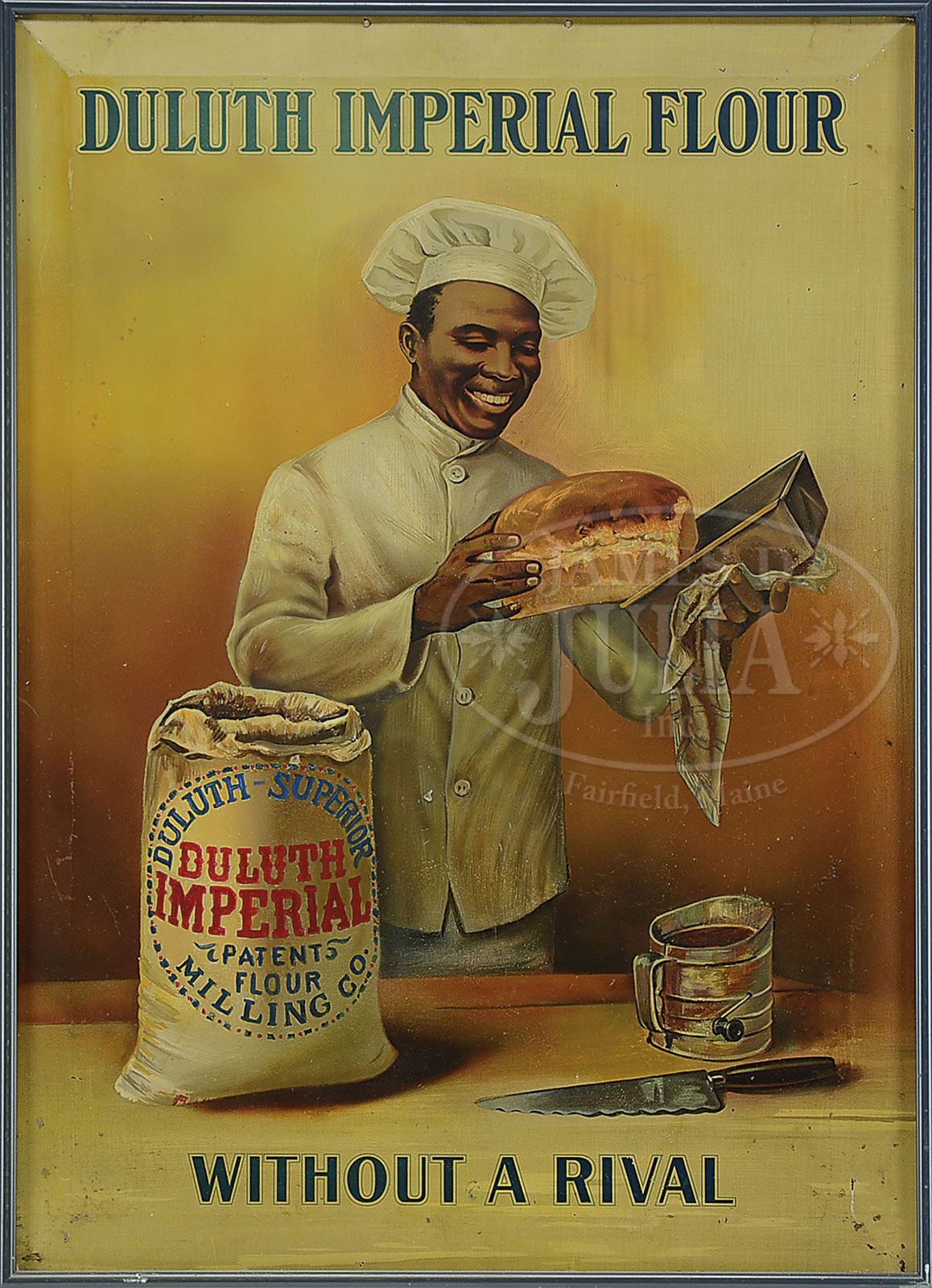LOT OF 7 MISCELLANEOUS ADVERTISING SIGNS.1) Kennedy’s Biscuits paper sign titled “Chimme Fadden (The Bowery Boys) Biscuit”. Image of the Bowery Boy with a bowler hat and stogie with a New York city streetscape in the background. The New York Biscuit Co., New York, Chicago and Boston. 2) Butter-nut bread cardboard die cut sign. Illustration of a young baker with over-sized bread knife. 3) Butter-nut bread cardboard die cut sign with image of young girl eating a slice of bread. 4) Heinz Mince Meat cardboard sign featuring illustrations of a Mince Meat stoneware crock and jar. 5) Armour’s “Star” ham self framed tin sign. Images of a variety of ham dishes. Captioned “The Ham What Am and Bacon Too”. American artworks, Coshocton, Ohio. 6) Duluth Imperial Flour tin sign. Scarce sign with illustration of black chef taking a hot loaf of bread from the oven. Captioned “Without a Rival”. 7) Carr & Co.s Biscuits R.O.G. sign in frame. Reverse etched with gold foil highlights in its original wood frame. SIZE: 1) Image: 13-1/2″ w x 19-3/4″ h. 2) Image: 10-1/2″ w x 13-1/2″ h. 3) Image: 10-1/2″ w x 13″ h. 4) Image: 30-1/2″ w x 11-1/2″ h. 5) Image: 12-1/2″ w x 37″ h. 6) Image: 17-1/2″ w x 24-1/2″ h. 7) Overall 59″ w x 9-3/4″h. PROVENANCE: The Collection of Richard J. Miller. CONDITION: 1) Very good; few closed tears top left and right; a few horizontal roll creases. 2) Near exc. 3) Near exc. 4) Near exc.; only flaw is a vertical fold line. 5) Near exc. 6) Very good to exc.; some light scattered pitting at bottom left and right corners. 7) Very good to exc.; bottom edge possibly trimmed. 1-15102 (600-900) – Lot 1612 Auction: Advertising, Toy & Doll Auction - Fall 2014 Please Note: All prices include the hammer price plus the buyer’s premium, which is paid by the buyer as part of the purchase price. The prices noted here after the auction are considered unofficial and do not become official until after the 46th day. |