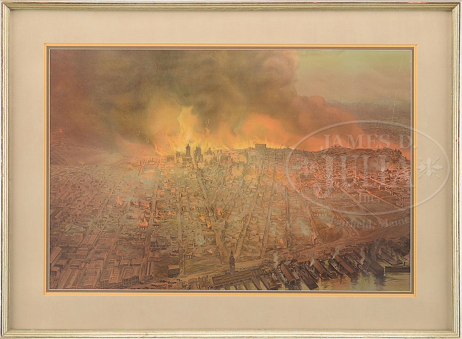 SIX LARGE FRAMED FIRE RELATED 19TH-20TH CENTURY PRINTS. 1) Chromolithograph “Leydens Ramp – Désastre de Leide”, 1807, by Jan Willem Pieneman. 2) Chromolithograph “The Burning of San Francisco, April 18, 19, 20, 1906” published by Schmidt Lithograph Co. S.F. 3) Chromolithograph European fire, unknown. 4) Chromolithograph “Heroes of Peace” circa 1845, published by E.S. Robinson, Bristol 5) Chromolithograph “Leydens Ramp – Désastre de Leide”, 1807, by Jan Willem Pieneman 6) Colorized engraving “Vue des 40 jours d’incendie des habitations de la plaine du Cap français arrivée le 23 août 1791 vieux style” by Jean-Baptiste Chapuy; Pierre Jean L Boquet. SIZE: 1) 26″ x 32″ Overall: 34″ x 40″ 2) Sight: 20″ x 30″ Overall 28-1/2″ x 38-1/2″ 3) Sight: 23″ x 33-1/2″ Overall: 33-1/2″ x 40-1/2″ 4) Sight: 21″ x 31″ Overall: 31-1/2″ x 41″ 5) Sight: 24″ x 29″ Overall: 34″ x 39″ 6) Sight: 20-1/2″ x 28-3/4″ Overall: 30″ x 38-1/2″. PROVENANCE: Massachusetts National Fire Protection Association CONDITION: Not examined out of frames, four have no margins visible, one showing margin with roughness, minor creases & stains, generally very good 7-70454 (800-1,200)
