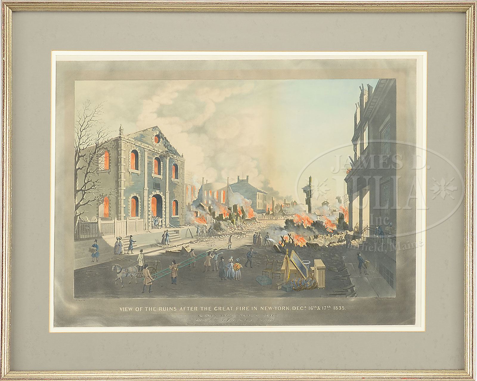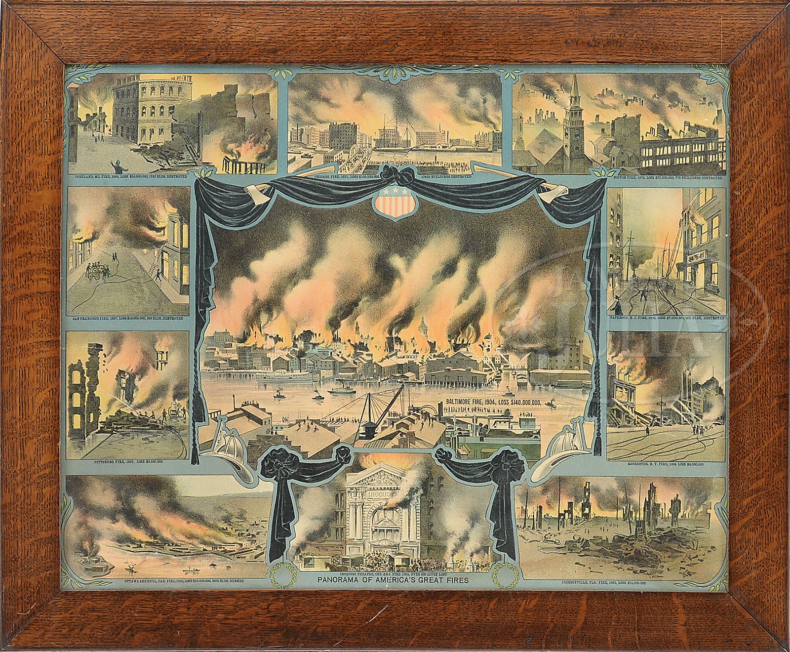 LOT OF NINE AMERICAN FIRE RELATED COLORED ENGRAVINGS & LITHOGRAPHS. 1)”The Fireman’s Procession Passing the Washington Monument, Union Square Evening Sept. 1st 1858″ Litho by Sarony, Major & Knapp, 449 Broadway, NY 2) “View of the Great Conflagration of Dec 16th and 17th 1835: From Coenties Slip” 3)”Representation Du Feu Terrible A Nouvelle Yorck” 18th Century Francois Xav Habermann 4) “Conflagration of Part of the US Armory Springfield, MASS 1824 5) Fire Department Certificate Published by Currier & Ives, 1877 6) “Panorama of America’s Great Fires Lithograph 7) “View of the Ruins After the Great Fire in New York, 1835” 8) “The Old Phila. Fire Department.Period of 1850” Copyright 1882 by Chas. K. Spieler 9) “The New York World Building Fire” Published by Wm. Bruns, NY All housed in a modern decorative gilt frame with matte SIZE: 1) Sight: 4-1/2″ x 6-3/4″ Overall: 15-1/2″ x 14-3/4″ 2) Sight: 11-1/2″ x 15-1/2″ Overall: 19-1/4″ x 23″ 3) 11-1/2″ x 16″ Overall: 18″ x 22-3/4″ 4) Sight: 13-1/2″ x 17-1/2″ Overall: 19-1/2″ x 23-3/4″ 5) Sight: 19-3/4″ x 14-3/4″ Overall: 27″ x 22″ 6) Sight: 15-1/2″ x 19-1/2″ Overall: 19-1/2″ x 23-1/2″ 7) Sight: 20″ x 27″ Overall: 28″ x 35″ 8) Sight: 23-1/2″ x 30″ Overall: 32-3/4″ x 39″ 9) Sight: 23″ x 29″ Overall: 33″ x 39″ PROVENANCE: Massachusetts National Fire Protection Association CONDITION: Not examined out of frames. 1-4) Having some foxing & toning with some roughness to edges 5-9) Very good 7-70456 (1,000-1,500)