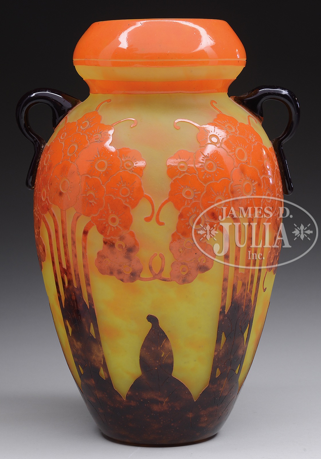 LE VERRE FRANCAIS CAMEO GLASS VASE.Le Verre Francais vase has mottled brown shading to orange cameo flowers encircling the body of the vase. Vase is further decorated with two applied purple glass handles and is signed on the side in cameo “Charder”. SIZE: 10-1/4″ t. PROVENANCE: The Susan & Roy Bittan Collection. CONDITION: Very good to excellent. 48969-4 (2,000-3,000) – Lot 1616