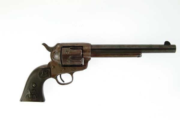 COLT SINGLE ACTION ARMY REVOLVER. SN 155308. Cal. .45LC, 7-1/2″ round bbl, all matching. Single line, roll stamp, Colt Frontier Six Shooter on the left side of the bbl. 2-line patent marking, eagle grips. CONDITION: Fine overall. 85% thinning blue on bbl, 25% on ejector rod housing and cylinder, faint traces backstrap and triggerguard. Faded case-hardening color on the frame, with scattered light pitting. Bright case-hardening colors on the back of the hammer, mostly faded on the sides. Grips are fine showing only light wear but faded on the bottom. Action is fine. 4-47166 FS419 (1,500-2,500)