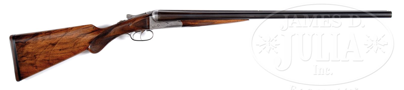 *A.H. FOX BE GRADE.SN 14835. Cal. 12 ga. 26″ Krupp Fluid steel bbls, 2-3/4″ chambers. Choked: CYL/IMP CYL. Full length matted rib with “certifiable pre-ban ivory” mid bead and ivory colored front bead. Double triggers, automatic ejectors, non-automatic safety. Full pistol grip buttstock, checkered in two point pattern with 14-3/8 LOP over Decelerator buttpad, checkered side panels. Splinter forearm with Deeley release, lightly checkered in three point pattern towards frame. Receiver lightly engraved with quail on left, woodcock on right surrounded by light scroll, and light scroll on bottom. Weight: 7 lbs. 2 oz. Special Note: This item contains or is made of ivory. Do not bid on this lot unless you have read and agreed to our "Ivory Position Statement" and the "Waiver of Legal and Financial Risk to James D. Julia in regards to your Purchase of an Ivory Object." This information is located in the front section of our catalog. CONDITION: Very good, bbls retain 60-70% blued finish with light handling marks, carry marks and scratches throughout. Buttstock and forearm have been sanded and refinished and retain nearly all of their hand rubbed finish, checkering re-cut, a couple of old repairs behind top tang with lines running to frame on both sides. Receiver retains traces of orig case color. Mechanics are very good, ejectors slightly out of time, bores are bright and shiny. 49417-84 JSL192 C&R; IVORY (1,500-2,000) – Lot 1619