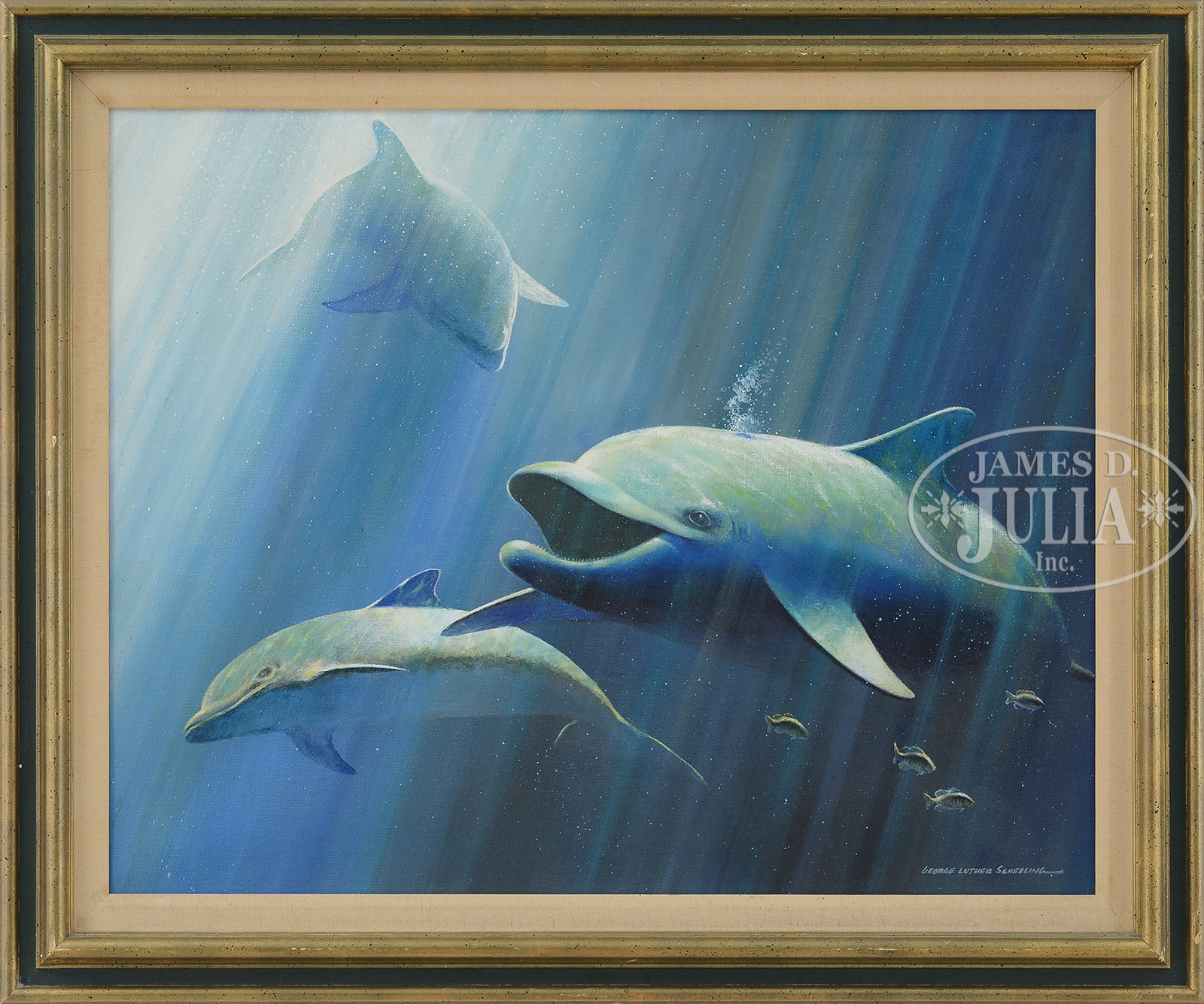 GEORGE LUTHER SCHELLING (American, 1938-) DOLPHINS.Oil on canvas Housed in a painted & gilt wood frame with linen liner Signed lower right “George Luther Schelling” SIZE: 24″ x 30″. Overall: 30″ x 36″ CONDITION: Very good 50732-7 (1,000-2,000) – Lot 1619