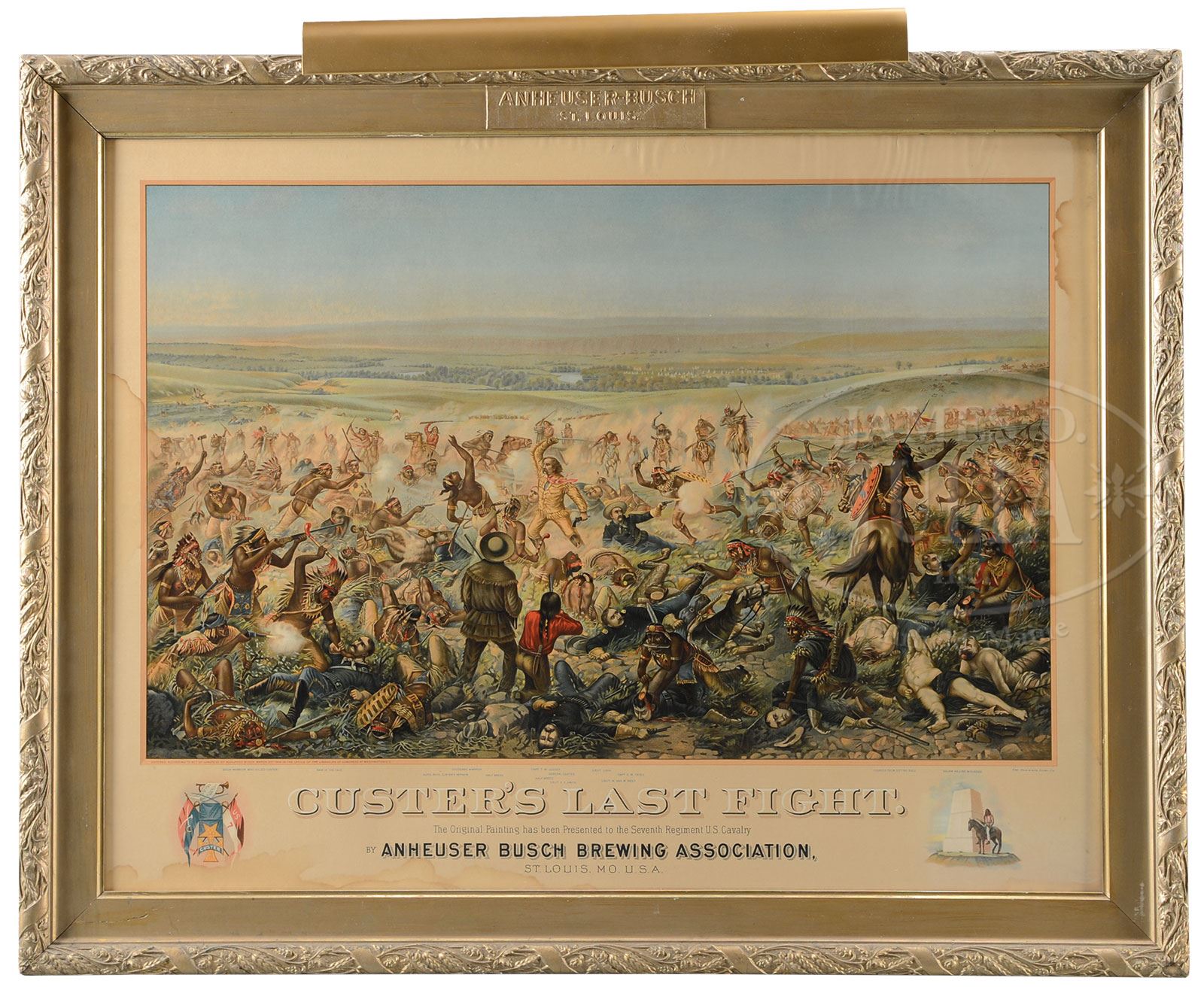 ANHEUSER-BUSCH CUSTER’S LAST FIGHT LITHOGRAPH.Well-known image depicting a panoramic scene of the annihilation of Custer’s troops and was a popular advertisement produced by the company. This is the earlier 1896 version and is housed in its original gilt gesso frame which has been affixed with a light to shine on the busy and bloody action below. SIZE: 48″ w x 38-1/4″ h overall. CONDITION: Couple of small margin tears and some water staining with some reaching into the image itself. This has resulted in some rippling to the paper in the upper right quadrant. Otherwise very good. 1-14985 (600-1,200) – Lot 1620 Auction: Advertising, Toy & Doll Auction - Fall 2014 Please Note: All prices include the hammer price plus the buyer’s premium, which is paid by the buyer as part of the purchase price. The prices noted here after the auction are considered unofficial and do not become official until after the 46th day. |