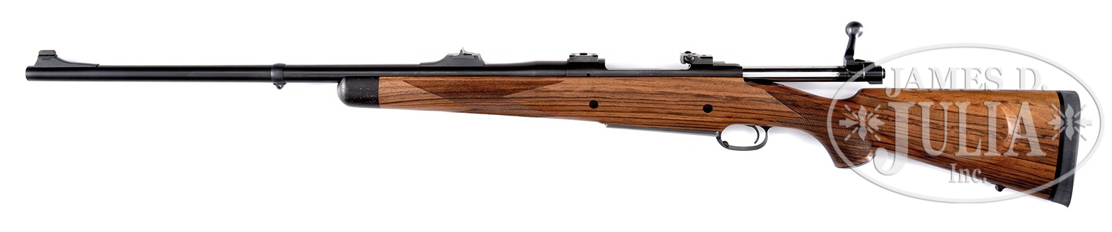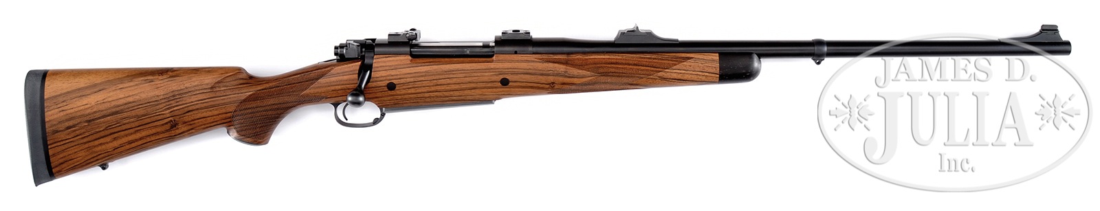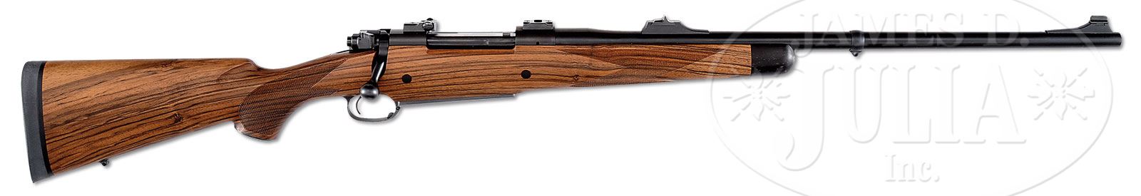 *DAKOTA “AFRICAN GRADE” MODEL 76 BOLT ACTION RIFLE.SN R0068. Cal. .416 Rigby. On Dakota’s Magnum length version of their famous 76 action, is fitted with 24″ bbl with express sights and drop box magazine. Classically styled stock with right hand cheekpiece and contrasting wood forend tip, is of nicely streaked select walnut. CONDITION: Excellent, essentially as new, with only the faintest of handling marks in wood and metal. Appears unfired. 50150-2 MGM246 (6,000-8,000) – Lot 1621
