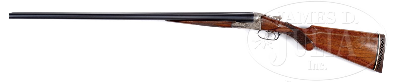 SN 25513. 12GA, 30″ Chromox fluid steel bbls, 2-5/8″ chambers, Chokes: Full/Full, Full length matted rib with steel front bead, #2 weight bbls, double triggers, automatic ejectors, automatic safety. Full pistol grip butt stock with 14-1/4″ LOP over “White Line” waffle pad. Splinter forearm with Deeley release checkered in two-point pattern. Buttstock checkered in two-point pattern. Receiver engraved in typical open floral A grade and marked “Ansley H. Fox”. WEIGHT: 7 lbs, 8 oz. CONDITION: Excellent. Bbls retain 97% of professional restored finish. Markings are crisp and sharp. Buttstock and forend retain most of an older professionally restored finish. Forend with minute loss at tip on left side and stocks with various light handling marks throughout. Receiver retains a trace or two of orig case color but has turned mostly gray, engraving still fairly sharp. Mechanics are excellent, bright shiny bores. 49417-90 JSL201 C&R (1,000-1,500) – Lot 1622