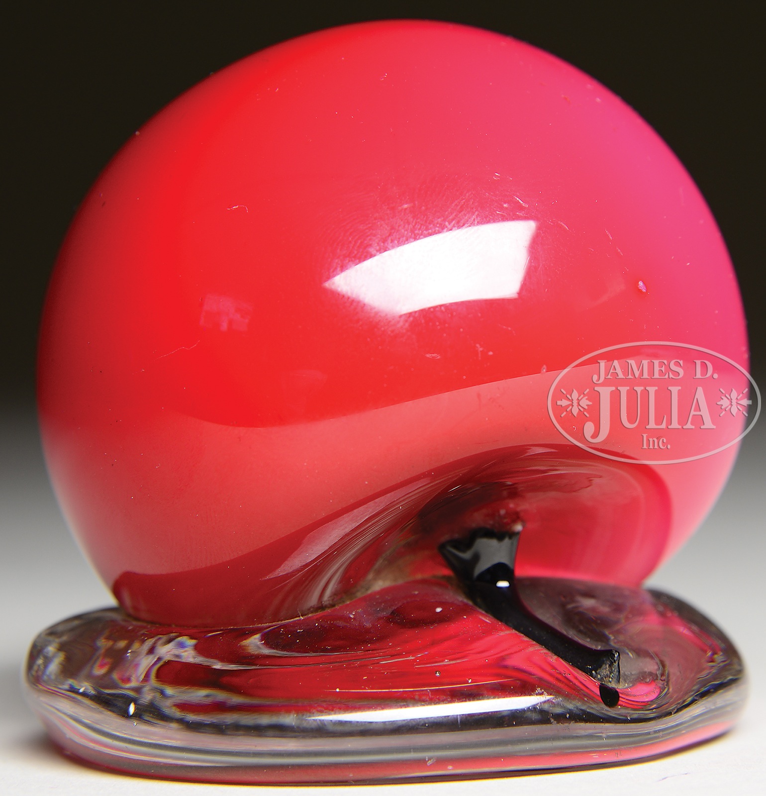 NEW ENGLAND APPLE PAPERWEIGHT.New England Glass Co. paperweight is in the form of a red apple with black stem. Apple rests on a clear glass foot. Unsigned. SIZE: 2-1/2″ t. CONDITION: Small accidental blob of glass near the apple’s bottom from the making. Otherwise very good to excellent. 5-67865 (800-1,200) – Lot 1624