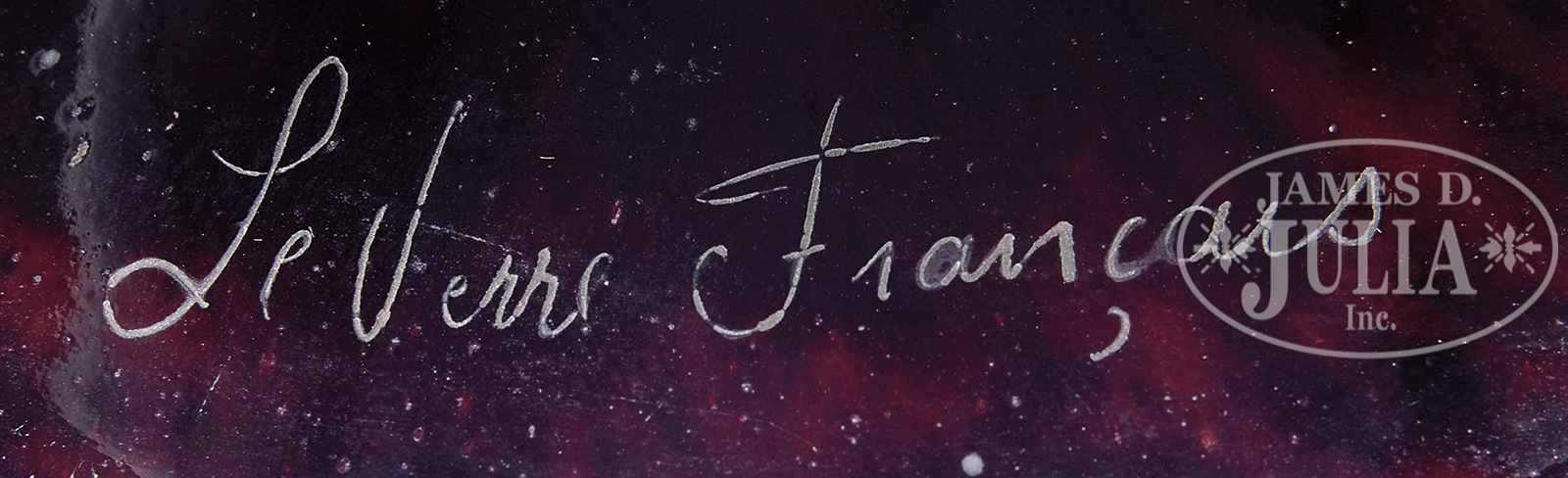 MONUMENTAL LE VERRE FRANCAIS COMPANULES VASE.Monumental Le Verre vase in Campanules design has stylized flowers, stems and tendrils in mottled violet glass against a mottled orange and yellow background. Vase has a cameo honeycomb design surrounding lip. Signed on top of foot “Le Verre Francais”. SIZE: 25-1/4″ t. CONDITION: Some minor scratches to side of foot otherwise very good to excellent. 49813-5 (1,500-2,500) – Lot 1624