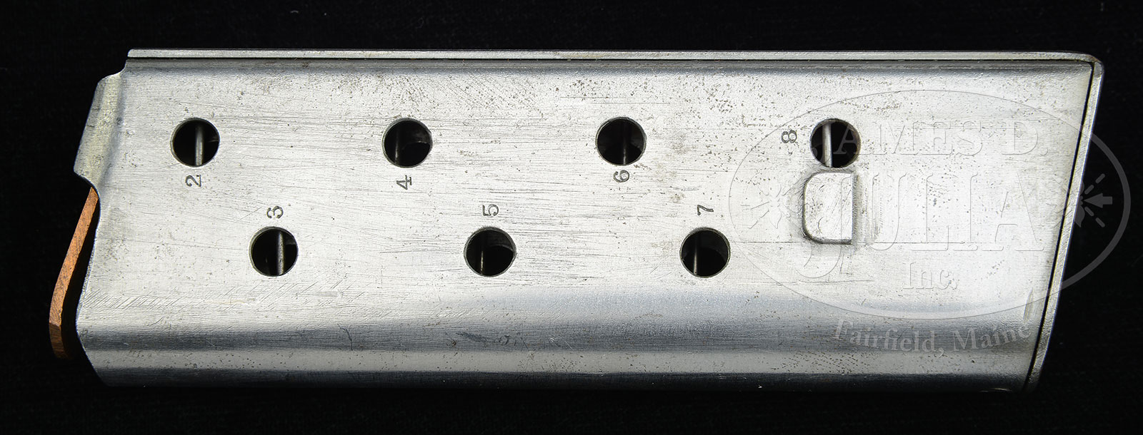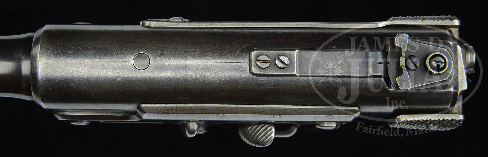 *RARE WHITE MERRILL EXPERIMENTAL .38 CAL PISTOL, FIRST VARIATION.NSN. Cal .38. After the M1907 White-Merrill pistol with its one-handed cocking features was rejected by the US military, Merrill went to work on another pistol design he hoped would be of more interest. In 1908, J.C. White developed a large .38 Cal. automatic pistol that functioned as a delayed blowback with an internal hammer and an eight shot magazine. 7-1/2″ round bbl with pinned front sight. Horizontally adjustable rear sight fastened to the receiver. At the rear of the bolt are two coarsely checkered panels for retraction, the right panel extending to serve as a coverplate over the chamber. Attached to the left side of the frame is a ridged plate to move the holster away from the cocking lever whose positions were denoted: “Half Cock” and “Full Cock”, the half-cock position serving as the safety. Each grip plate made of smooth brown Bakelite and secured with two small screws. Single column magazine with brass follower, seven indicator holes numbered 2-8, is in the white. Made with a separate piece for the spine that is screwed into place with eight screws. An additional screw is used to secure the front of the floorplate. This example, with no manufacturer markings or SN, has a mechanical issue in that the bolt cannot be fully retracted to examine the chamber or cock the action. Furthermore, the half cock and full cock lever, while tensioned, do not operate as intended. Included with this gun is a set of copies of the original J.C. White patent No. 888,560 for this prototype design. Also, a hang tag from early owner, Alex Montgomery. Montgomery was one of the very first major collectors of early experimental pistols. This exact pistol is illustrated in a display article by Montgomery on pp.53-62 of World’s Guns and Other Weapons, 1958. PROVENANCE: The Frank H. Wheaton, III Collection. CONDITION: The pistol, likely completed with a thin coat of rust blue, has transitioned to a mellow grey over 70% of its surface. Excellent Bakelite grips. Magazine body and floorplate are bright metal with minimal oxidative toning. Bright bore with sharp rifling. Even though the mechanics need adjustment, this is still a rare developmental pistol that, while never considered by the Ordinance Dept, is usually grouped together with those kinds of arms. 51516-4 LMA (9,500-15,500) C&R – Lot 1625 Click here to view provenance