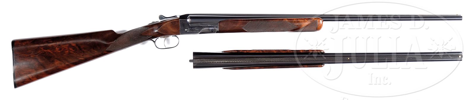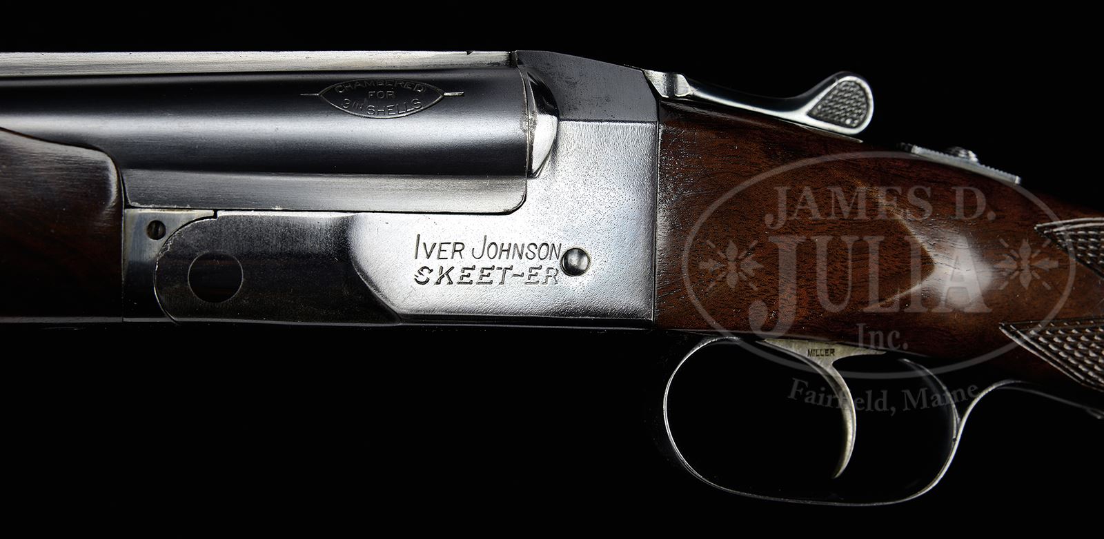 *IVER JOHNSON SKEET-ER .410 WITH EXTRA BARRELS AND CASE.SN 3018E. Cal. .410 ga. 2 sets of 26″ chopper lump bbls, each with their own ejector forend. Blued boxlock action features Miller selective trigger with selector on tang. Left side of action is marked “Iver Johnson SKEET-ER”. American walnut straight grip buttstock with marbling similar to that found in European walnut, is checkered at grip, and measures 14-1/2″ over ribbed composition buttplate. Forends are of beavertail type, and have Deeley releases. An area has been milled out at head of iron on set “2” to remove weight, and set “1” has lead weight screwed in. “1” BBLS: Bore diameter at muzzles: left -.401, right -.405. Drop at heel: 2-1/2″, drop at comb: 1-9/16″. Weight: 6 lbs 10 oz. LOP: 14-1/2″. “2” BBLS: Bore diameter at muzzles: left -.398, right -.389. Drop at heel: 2-9/16″, drop at comb: 1-9/16″. Weight: 6 lbs 5 oz. LOP: 14-1/2″. Gold cordura case is lined in burgundy cloth with paper Iver Johnson label in lid. Case contains 2-pc brass and rosewood cleaning rod with mop, brush and jag in black leather case, square oil bottle, and a pair of snap caps, as well as the key. Special Note: This item contains or is made of ivory. Do not bid on this lot unless you have read and agreed to our "Ivory Position Statement" and the "Waiver of Legal and Financial Risk to James D. Julia in regards to your Purchase of an Ivory Object." This information is located in the front section of our catalog. CONDITION: Excellent. Bbls retain over 95% of what appears to be their orig blue. Action retains approx 80% of its blue, silvered on bottom and sharp edges from normal hand wear. Stocks retain nearly all of what appears to be their orig finish with a number of light marks, checkering lightly worn. Bores are excellent. Action is tight. Ejectors are strong and in time with both sets of bbls. Trigger works. Case is excellent, near new. Sights are “certifiable pre-ban ivory” beads. 49290-9 MGM68 IVORY (5,000-8,000) – Lot 1627 Click here to view provenance