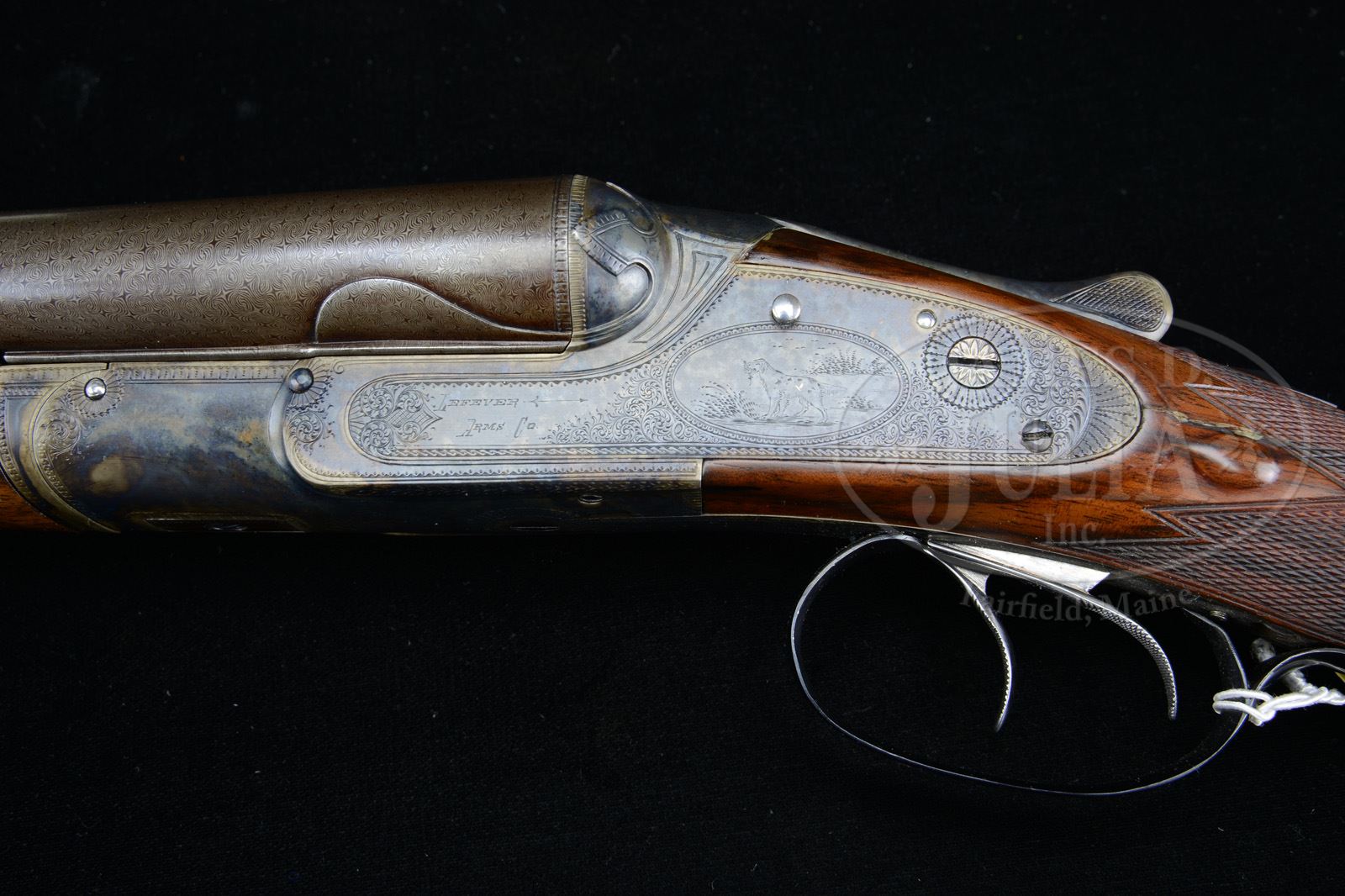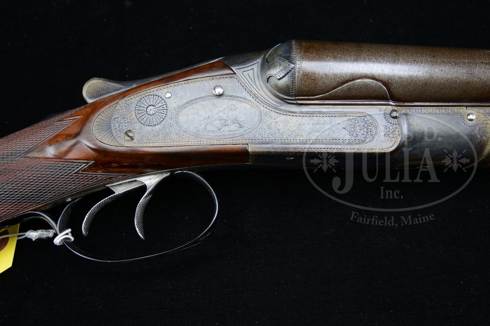 BEAUTIFUL RESTORED LEFEVER B GRADE.SN 10944. 12 ga. 30″ fine Damascus bbls. 2-3/4″ chambers. CHOKED: Mod/Full. Full length matted Damascus rib with synthetic ivory mid and front bead marked “Fine Damascus Steel. Lefever Arms Co. Makers & Patentees. Syracuse, NY.”. Checkered nickel plated triggers, extractors, automatic safety. Early pivot opener. Beautifully figured round knob pistol grip stock with 13-3/4″ LOP over 3/4″ checkered black HRBP. Buttstock is checkered in 4-pt pattern with waves near comb and tear drop behind lockplates. Gold shield near toe. Splinter forearm with early push button release and 2 tiered sculpted horn tip. Forearm, nearly fully in checkered 4-pt pattern. Receiver is beautifully engraved in early B grade pattern. Left side with setter and dead bird in his mouth in field scene surrounded by scroll and geometric pattern on stepped side plate. Top of frame nicely scroll engraved with geometric pattern. Right side with pointer standing on rock surrounded by scroll. Both lockplates marked “Lefever Arms Co.” Bottom of frame nicely scroll engraved with a burst of scroll and leaf pattern on rails. Fences are sculpted in point patten which extends into butterfly wings on bbls. Trigger guard is beautifully engraved with a bust of a spaniel carrying a harvested woodcock in his mouth surrounded by scroll and chain link border and encased in geometric pattern. WEIGHT: 7 lbs. 1 oz. CONDITION: Excellent as competently and completely restored by master gunsmith Brad Bachelder. Retaining most restored finish to both wood and metal. There is an old, now near invisible and fixed crack running from back of left lockplate to end of top tang. Bores are bright and shiny with a scattered light pit or two. Plenty of wall thickness. Mechanics are excellent. Gun is nice and tight. These early high grade Lefever’s are rare, hard to come by and amongst the best made of the American shotguns. 49619-1 JSL309 (8,000-12,000) – Lot 1628