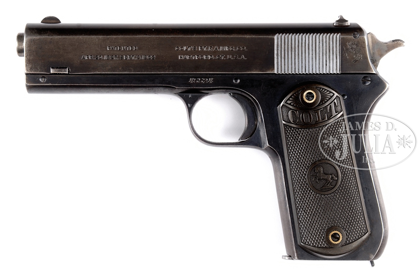*EXCELLENT COLT MODEL 1903 SPUR HAMMER AUTOMATIC.SN 45524. Cal. 38 ACP. Blue finish overall with a 4-1/2″ bbl. 2-pc hard rubber Colt monogrammed grips with nickel silver escutcheons. Fixed front and rear sight with case colored spur hammer. Manufactured in 1924 and comes with factory letter. Shipped to Simmons Hardware Company, St. Louis, Missouri, on September 8, 1924. CONDITION: Very fine overall, with most blue finish remaining. Thinning at muzzle. Front and rear straps have turned plum and edges of slide are rather bright. Excellent bore and mechanics. 51034-15 TDW (1,000-1,500) C&R – Lot 1629 Click here to view provenance