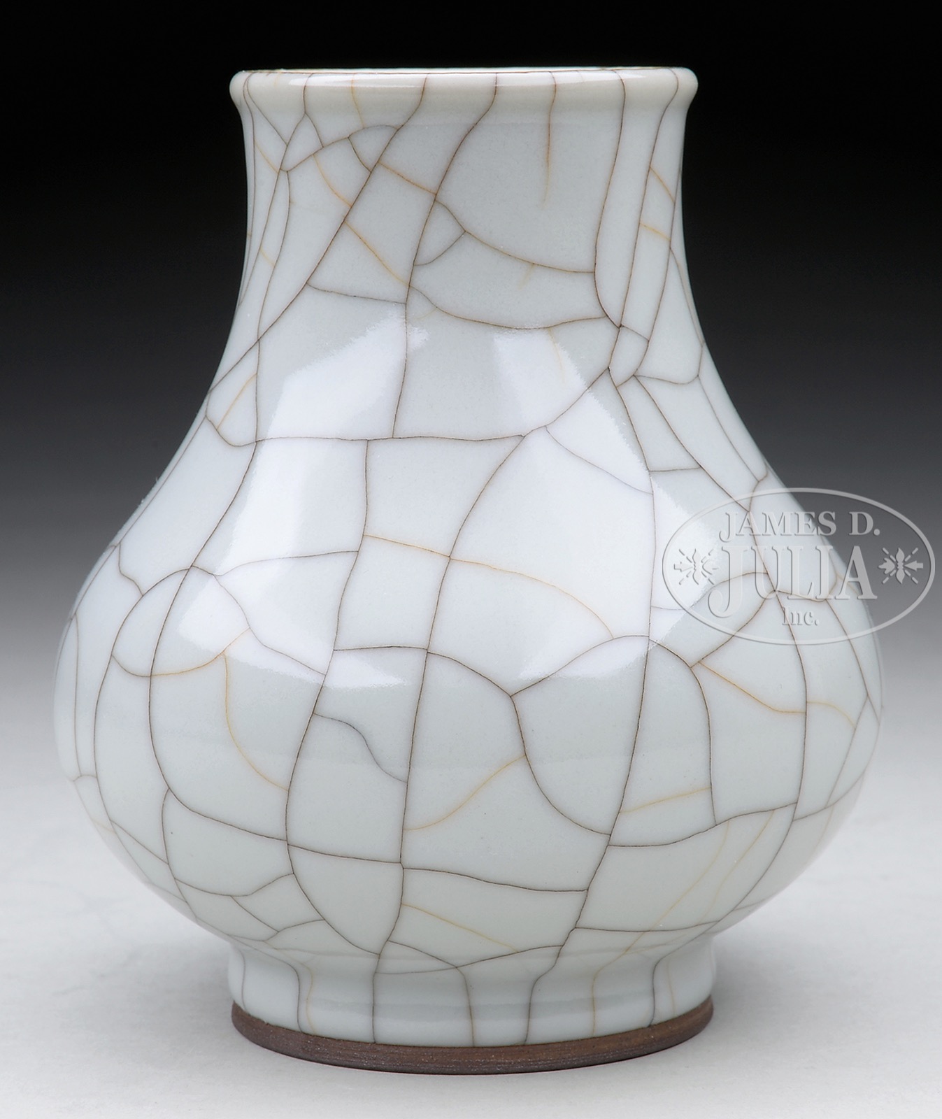 20th century, China. Vase made in Hu form and finished with a Ge-type glaze stopping cleanly just above the foot rim and continuing throughout the interior. SIZE: 4-3/4″ h. CONDITION: Very good. 51573-5 (600-900) – Lot 1629C