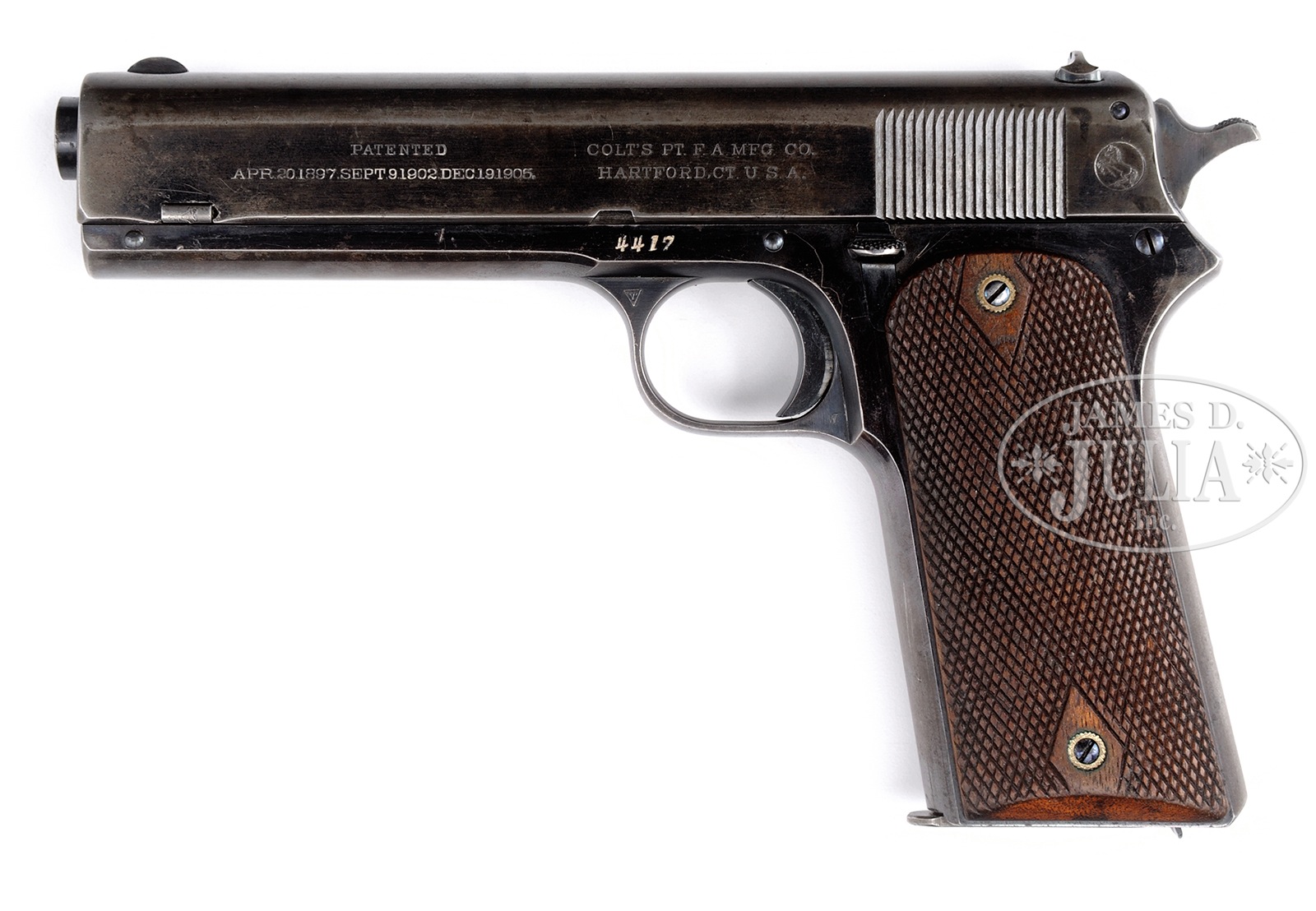 *DESIRABLE COLT MODEL 1905 45 AUTOMATIC.SN 4417. Cal. 45 ACP. Colt’s first venture into the 45 automatic pistol. The Model 1905 had a 5″ bbl, 7-rnd capacity, and shot the new 45 rimless cartridge. Bright high polished blue overall with 2-pc checkered walnut grips with brass escutcheons. Peacock blue trigger and slide release and deeply case colored hammer. Accompanied by Colt factory letter indicating manufacture as January 31, 1910, and shipped to Montgomery Ward and Company, Kansas City, Missouri, and confirms current configuration. CONDITION: Fine overall, with most factory finish remaining on frame. Bore and mechanics are exceptional with most case coloring remaining on hammer. Strong peacock blue finish remains on the trigger, slide release and extractor. The slide has been subjected to slightly more wear, and finish is rather thin and is rather plum. The 2-pc checkered walnut grips are very fine with only minimal wear but have suffered no cracking or chips. Orig bright polish magazine is excellent with no dents or damaged lips. 51034-17 TDW (2,000-3,500) C&R – Lot 1632 Click here to view provenance