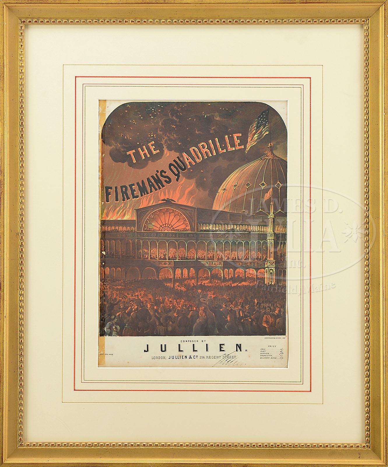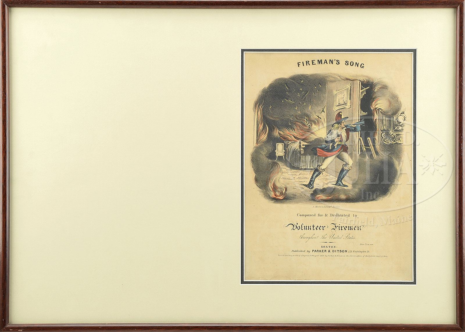 FOUR FRAMED FIRE RELATED 19TH CENTURY MUSIC. 1) Chromolithograph cover sheet music, (two-sided) “Fireman’s Song, Composed for and Dedicated to Volunteer Fireman throughout the United States” published by 1839 by Parker & Ditson 2)Chromolithograph sheet music cover ” The Fireman’s Polka”, composed by S, Macdona 3) Chromolithograph sheet music cover “The Fireman’s Quadrille” composed by Jullien 4) Chromolithograph sheet music cover “Fire Fiend, Grand March” by T.P.Ryder, 1872 SIZE: 1) Sight: 12-1/4″ x 9″ (each panel) Overall: 18″ x 25″ 2) Sight: 14″ x 10″ Overall: 23-1/4″ x 19-1/4″ 3) Sight: 13-1/2″ x 19-1/2″ Overall: 23-1/2″ x 19-1/2″ 4) Sight: 13-1/2″ x 10-1/4″ Overall: 19-1/2″ x 16-3/4″. PROVENANCE: Massachusetts National Fire Protection Association CONDITION: Very good overall with only slight imperfections, not examined out of frames 7-70464 (200-300)