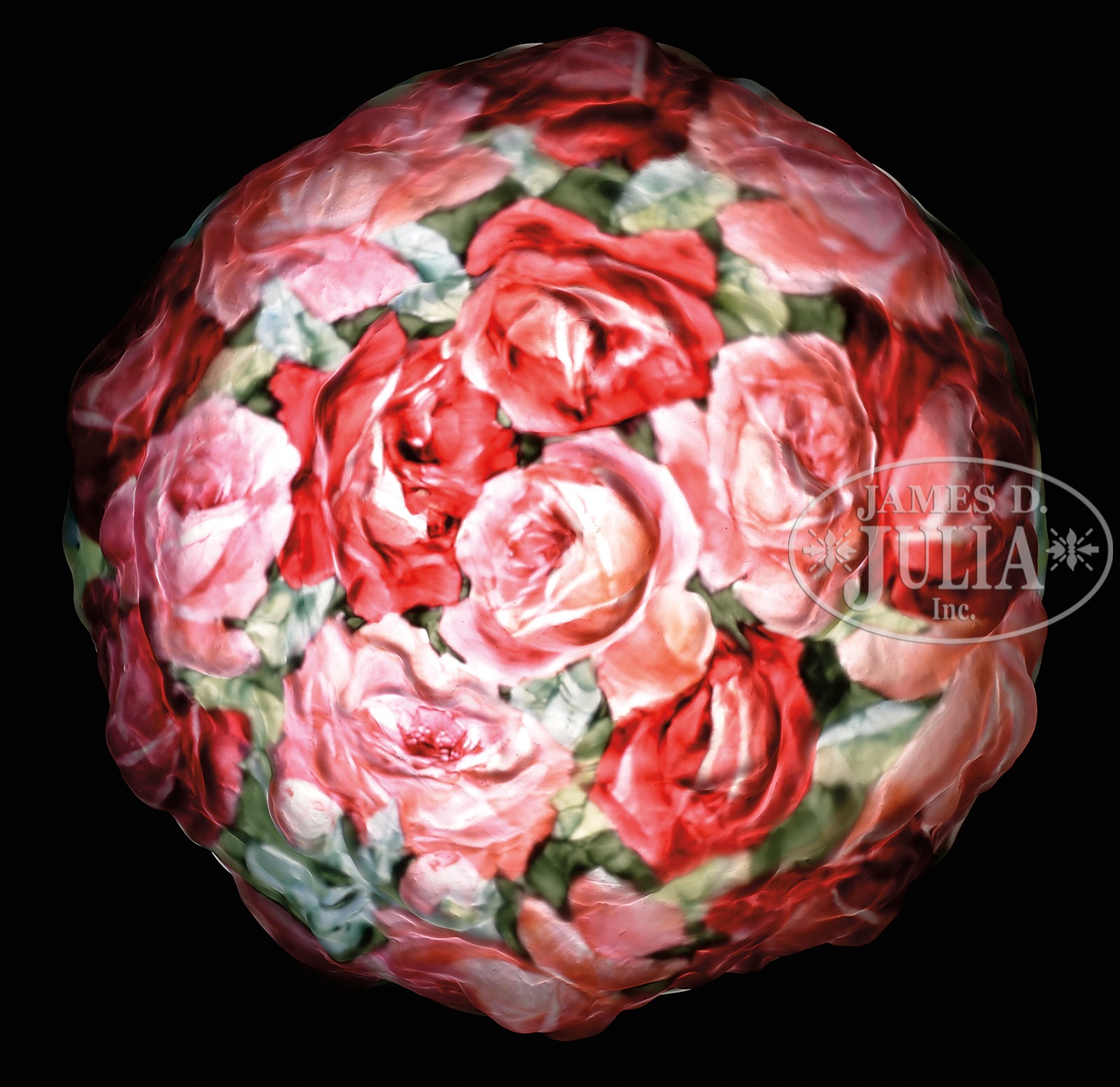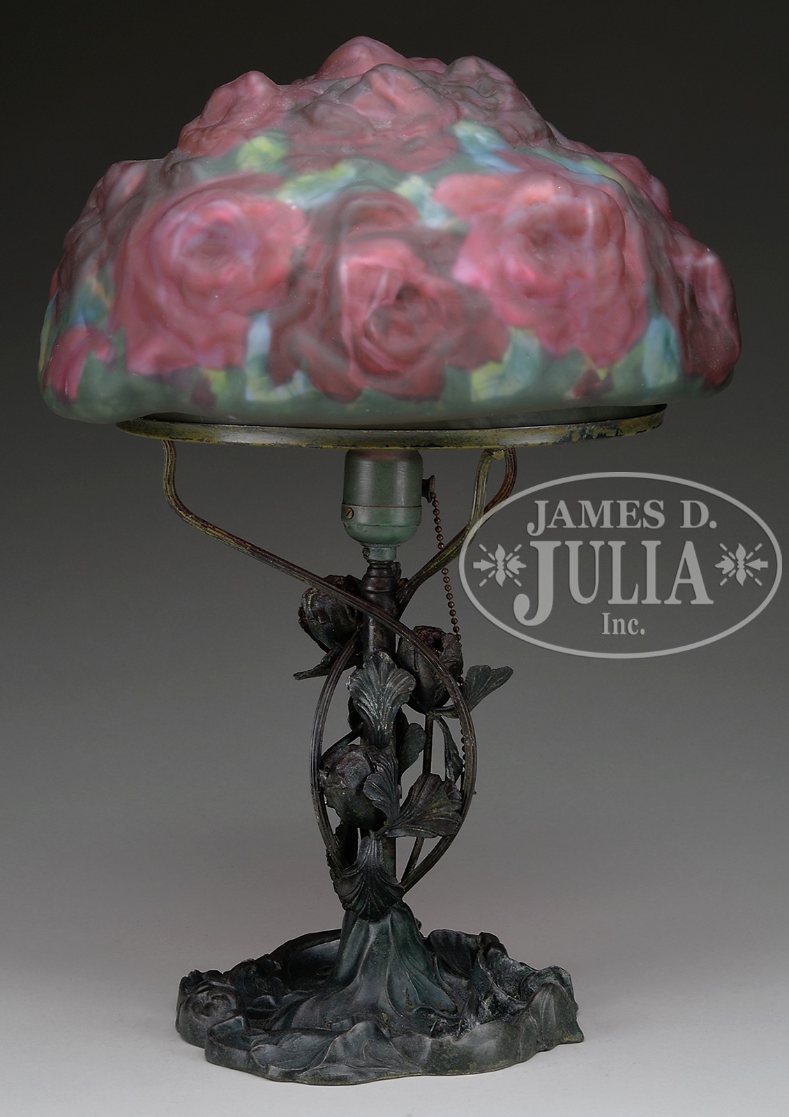 PAIRPOINT PUFFY ROSE BOUQUET TABLE LAMP.Pairpoint table lamp has puffy shade with blown out roses surrounding the shade and reverse painted in shades of pink and red all against a green leaf background. Shade rests on a figural Pairpoint poppy base with subtle green finish. Shade is signed on the side of fitter “The Pairpoint Corp”. Base is signed on the underside “Pairpoint” along with the Pairpoint Mfg. Co. logo “3057”. SIZE: Shade 12″ w with 10″ fitter. Lamp 19″ t. CONDITION: Shade is very good to excellent. Base has an old solder repair where one arm attaches to shade ring, some minor discoloration and corrosion to the finish. 1101-156 (9,500-11,500) – Lot 1634