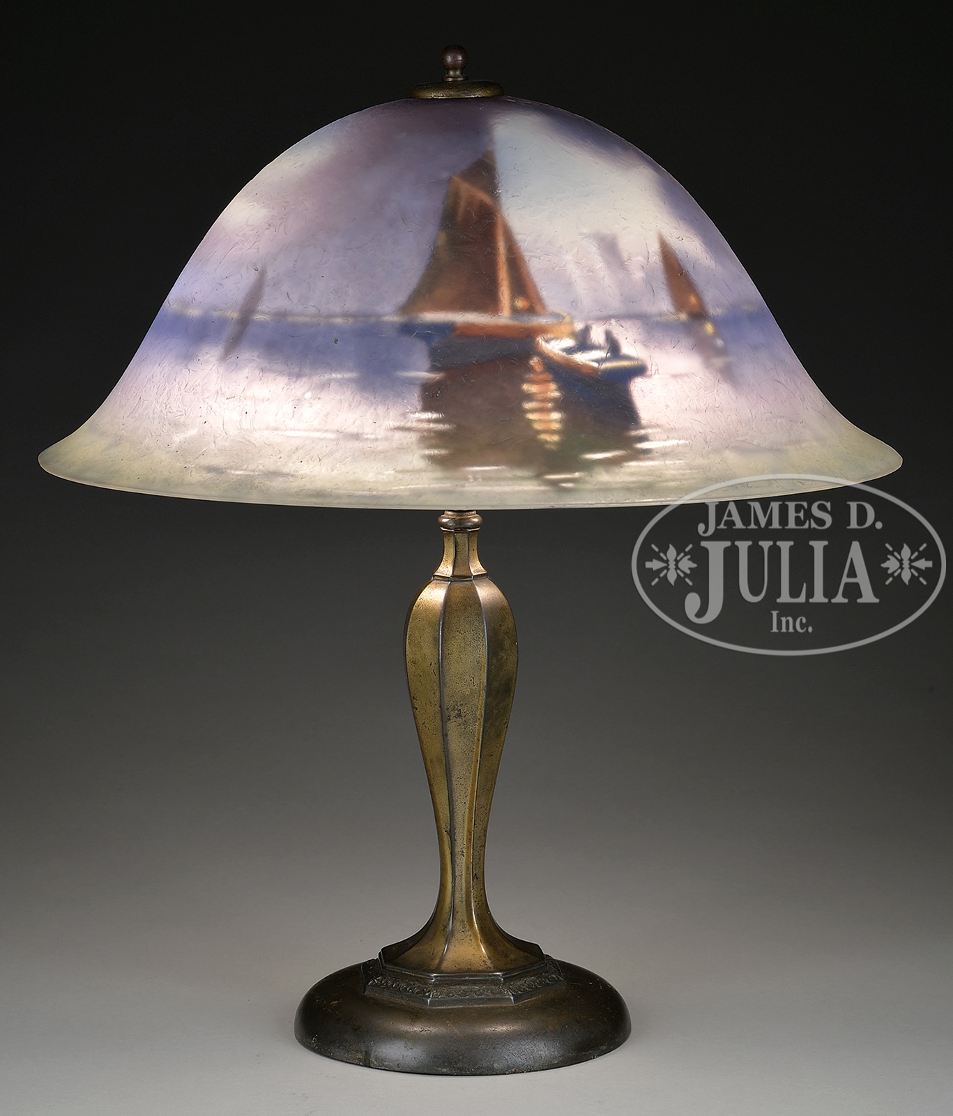 PAIRPOINT REVERSE PAINTED TABLE LAMP.Pairpoint table lamp has Copley shade reverse painted with a harbor scene showing sailing ships against a night sky. Shade is signed on interior rim “Pairpoint Corp’n in gold as well as artist signed “C. Durand” (Adolf Frederick). Shade rests on an original Pairpoint base marked “Pairpoint” with a “P” in a diamond and numbered “C3060”. SIZE: Shade is 15″ dia. Lamp is 17-1/2″ t. CONDITION: Shade is very good to excellent with minor flaking at fitter aperture. Base has wear to patina and rewired with appropriate cloth cord. 48957-14 (1,500-2,500) – Lot 1635