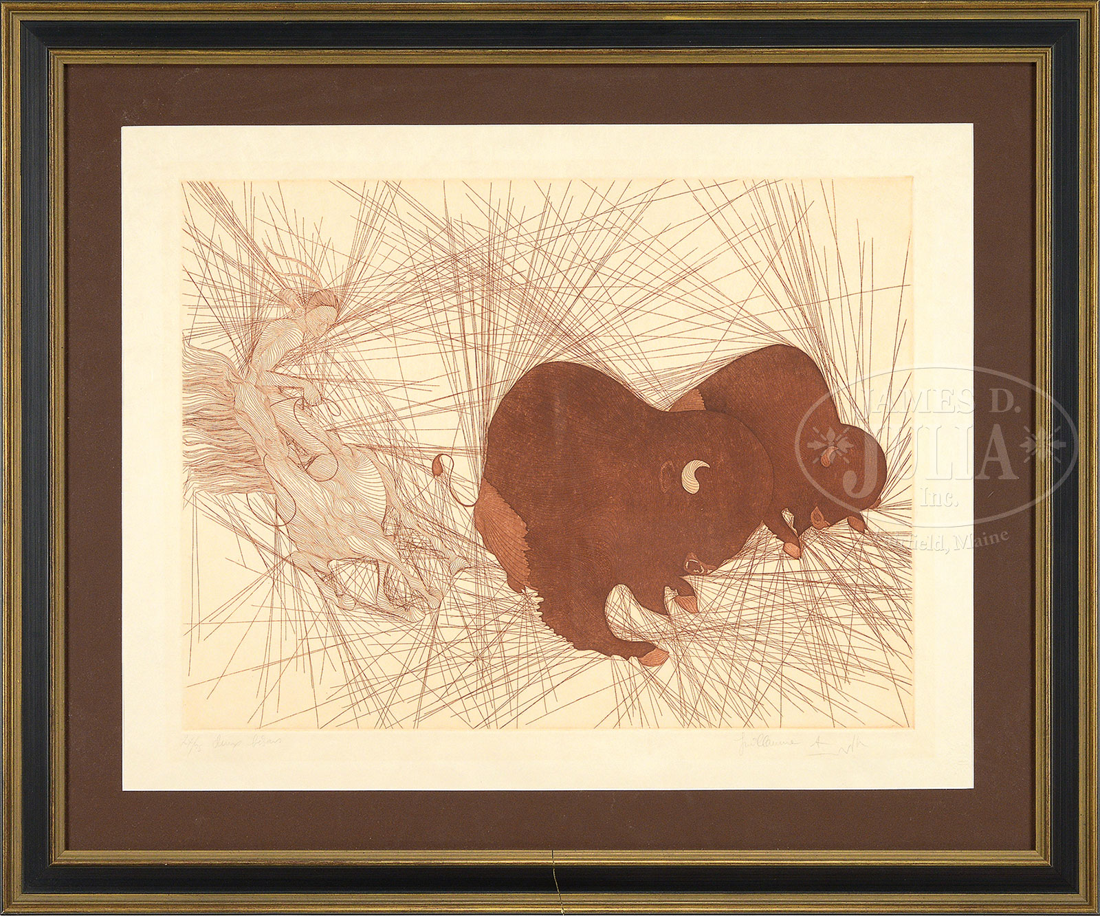 THREE FRAMED FRENCH PRINTS.1) LOUIS ICART (French, 1888-1950) “EVE RECLINING”, etching and aquatint, housed in a contemporary silver gilt frame matted under glass, signed lower right “Louis Icart”, engraved upper right “Edite par joubert et cie Paris”, numbered lower left with blind stamp “128” 2) GUILAUME AZOULAY (Israeli/American, 1949-) “DEUX BISONS”, sepia toned etching on rice paper, housed in a contemporary black frame matted under glass, signed in pencil lower right “Giulaume Az….”, blind stamp lower right “Waterman Edition” 3) AFTER AUGUSTE RODIN (French, 1840-1917) TWO NUDES EMBRACING, from “La Varende”, offset lithograph, housed in a contemporary goldtone molded frame, numbered lower left 295/300 with “M.R” stamp and “#499” identified on “The Great Dane Collection, Philadelphia” label affixed to verso, published by Les Editions Rombaldi, Paris, printed by J. Dumoulin, Paris SIZE: 1) Sight: 13-3/4 x 19-1/2″. Overall: 30-3/4″ x 36-3/4″ 2) Plate: 17-3/4″ x 23-3/4″. Overall 29-1/2″ x 35-3/4″ 3) 13-1/2″ x 10″. Overall: 28″ x 24-1/4″ CONDITION: All three in very good condition, not examined out of frame 52013-28 (1,000-1,500) – Lot 1637