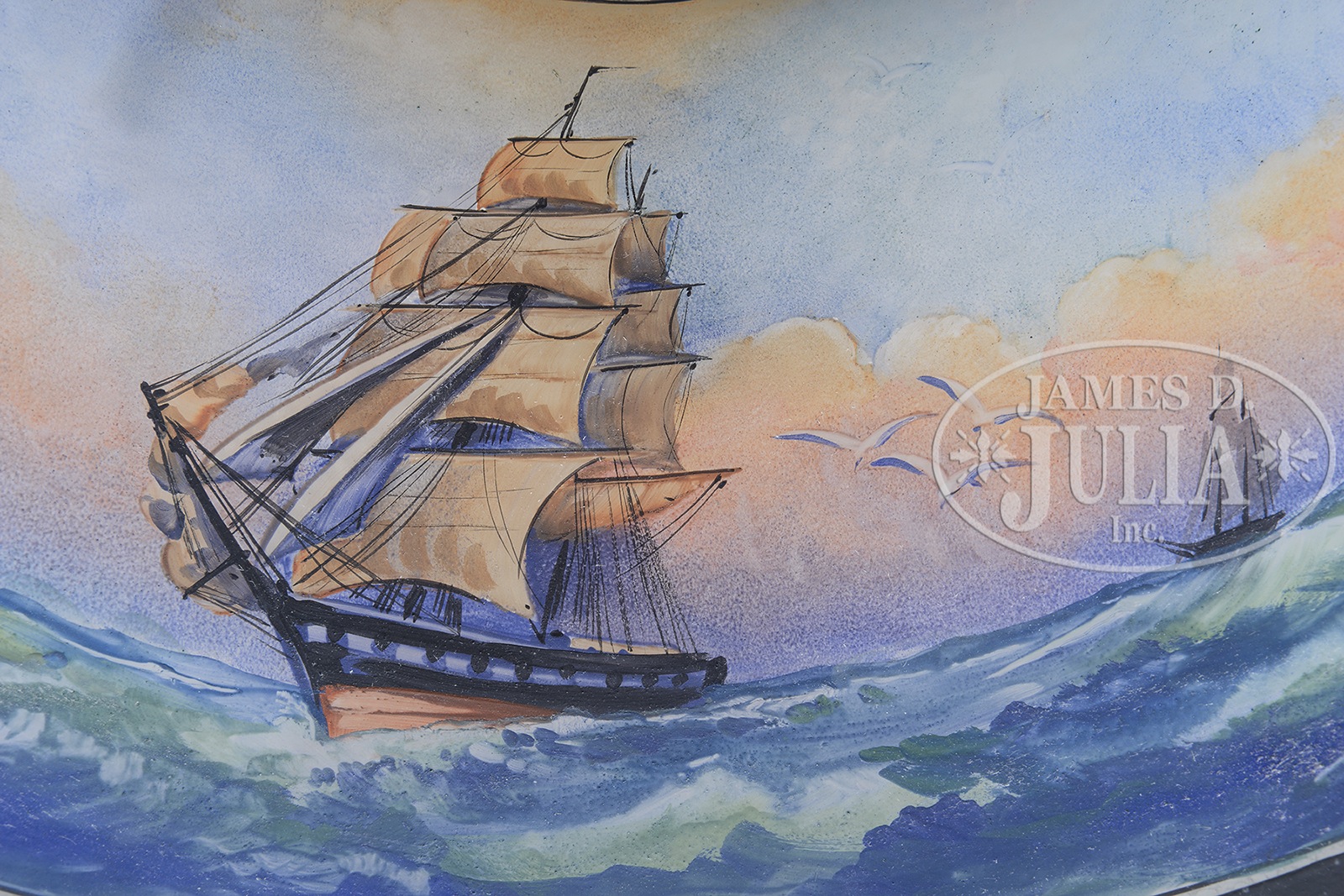 PAIRPOINT NAUTICAL TABLE LAMP.Pairpoint table lamp has reverse painted Lansdowne shade showing a Spanish galleon in high seas with other sailing ships in the background. Shade rests on a Pairpoint dolphin base with silvered finish. Shade is signed on the interior edge” The Pairpoint Corp’n”. Base is signed on the underside “Pairpoint D3076 1/2”. SIZE: Lamp 22″ t. Shade 15-3/4″ dia. CONDITION: Shade is very good to excellent. Base is very good with some wear and discoloration to finish. Rewired with contemporary plastic cord. 44208-4 (3,250-4,250) – Lot 1638