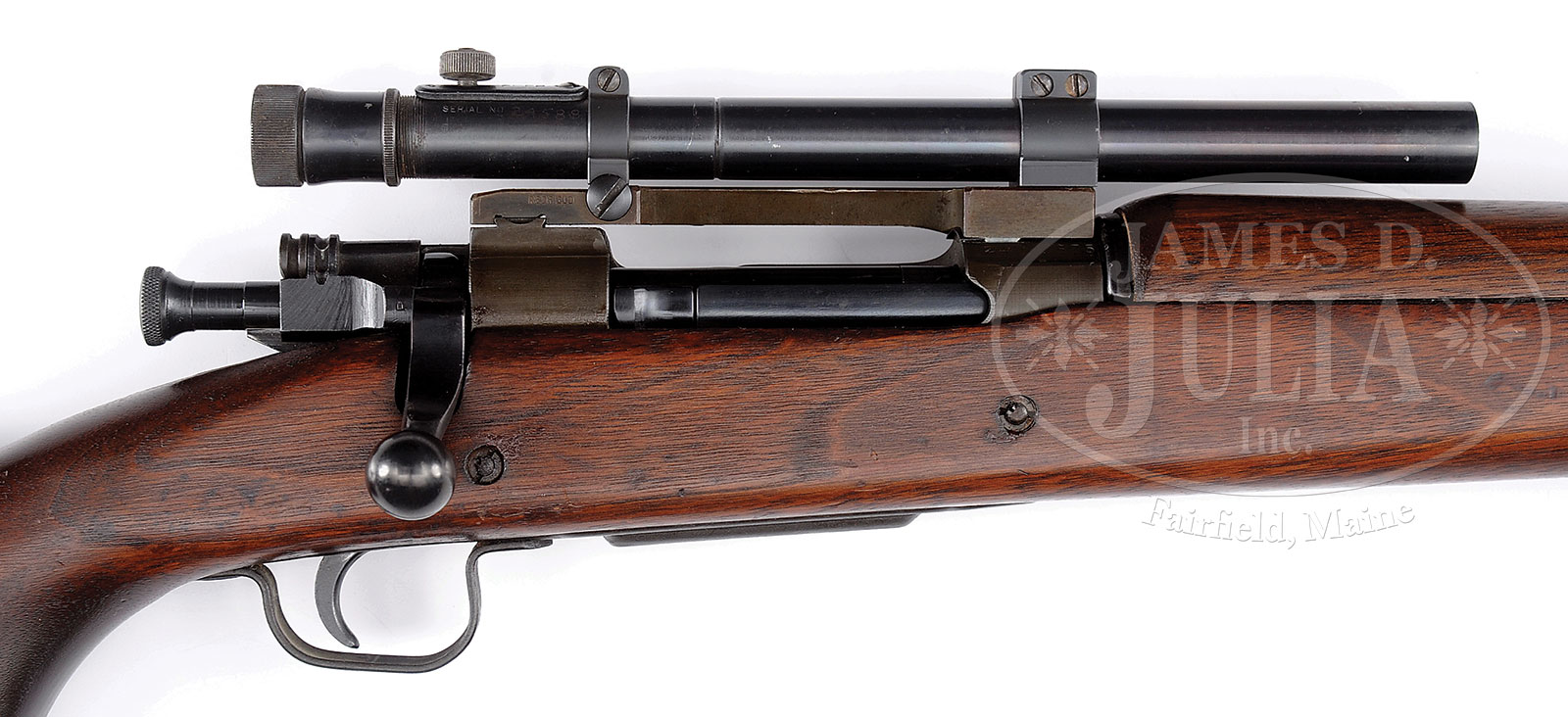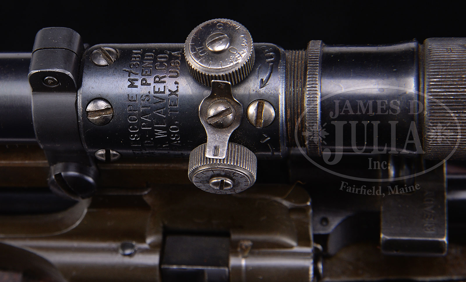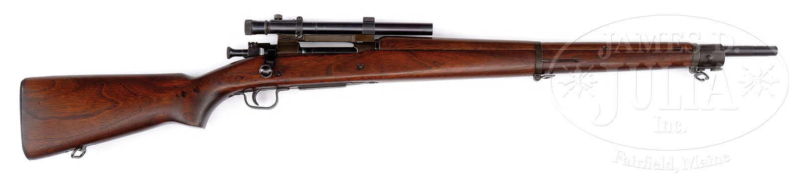 *SUPERB NEAR MINT ORIGINAL CONDITION REMINGTON 1903-A4 WW2 SNIPER RIFLE WITH WEAVER SCOPE.SN Z4002575. Cal. 30-06. Absolutely fantastic high orig condition specimen of a Remington 1903-A4 WW2 sniper rifle with Weaver scope, and leather scope caps. Marked on left side of receiver “U.S. REMINGTON MODEL 03-A3” With “R.A.” marked barrel with flaming bomb proof and “10-43” barrel date. Weaver scope with correct markings. Stock is devoid of any discernible proofmarks. “Z” prefix serial number places this gun in the correct range, and everything about this gun is consistent. CONDITION: Near mint with green-gray tinged orig finish on receiver, barrel, bands, end cap, and trigger guard/floorplate. Bolt has more of a lustrous deep blue finish as does the scope. Leather scope caps are in excellent condition. Stock is likewise near excellent with only the slightest of handling marks discernible upon close inspection. Bore is excellent, shiny and bright. Scope optics are clear. This rifle is from the collection of an advanced U.S. rifle collector and is in a condition impossible to upgrade. 51632-2 JWK90 (4,500-6,000) C&R – Lot 1640
