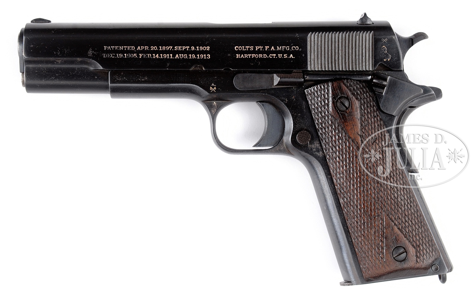 *VERY GOOD COLT WORLD WAR I MODEL 1911 CHAMBERED FOR .455 CALIBER.SN W40527. Cal. 455. 5″ bbl with British 455 designation and proof marks. Left side of slide marked “Colt Automatic Calibre 455”. Left side of slide has traditional 2-line patent address and 2-line Colt address with rampant Colt at rear of slide with British proofs above. Right side of fame marked “Government Model” with SN “W40527”. Left side of frame has British broad arrow proof and traditional British proofs. 2-pc diamond pattern checkered grips with appropriate trigger, hammer, safety and mainspring housing. Accompanied by a factory letter. PROVENANCE: Gerard Ruth Collection, ex Alex Chauffe SR. CONDITION: Good as refinished. Bore has strong rifling with darkness in grooves. Mechanics are crisp. Grips have moderate wear but are solid and have no material loss. Slight pitting exists under refinish but markings are sharp and legible. Magazine is an unmarked 45 ACP 1911 magazine. 51036-22 TDW (1,500-2,500) C&R – Lot 1643