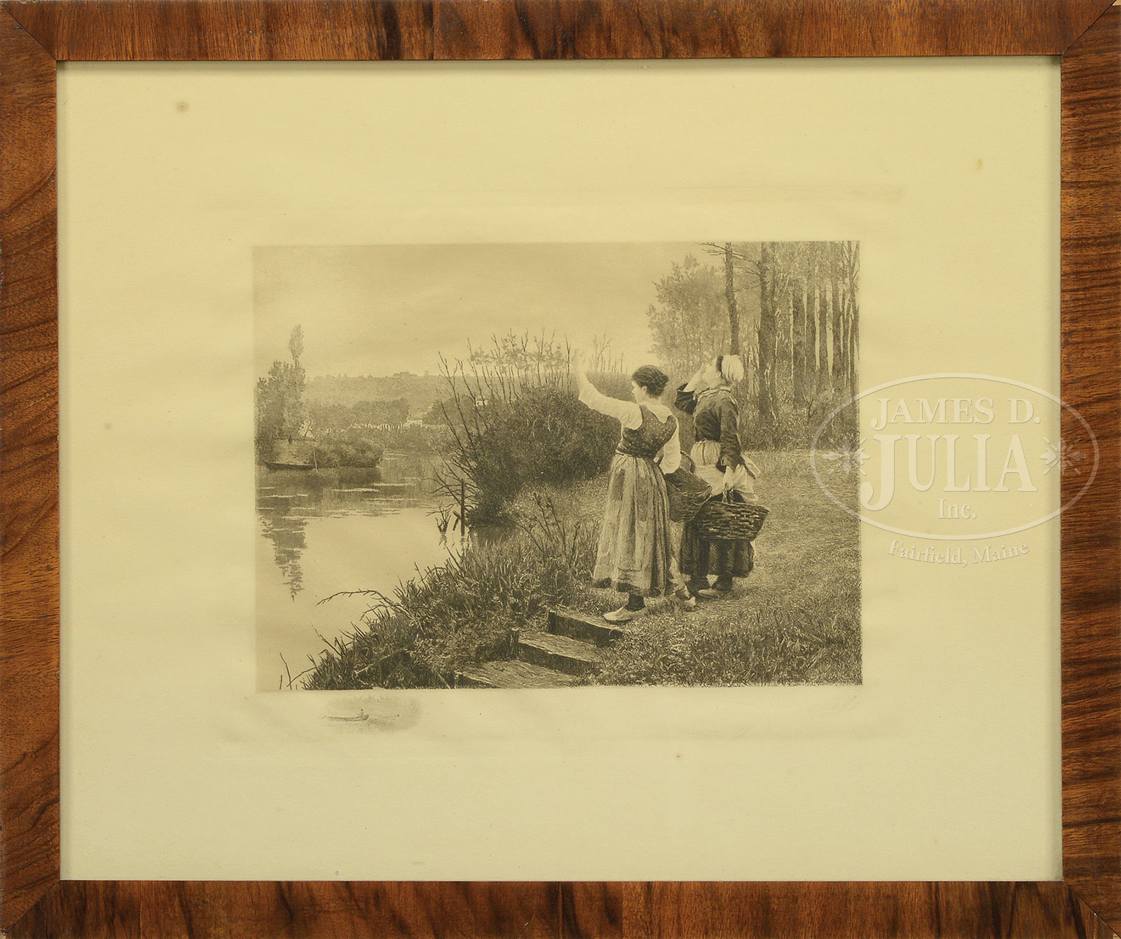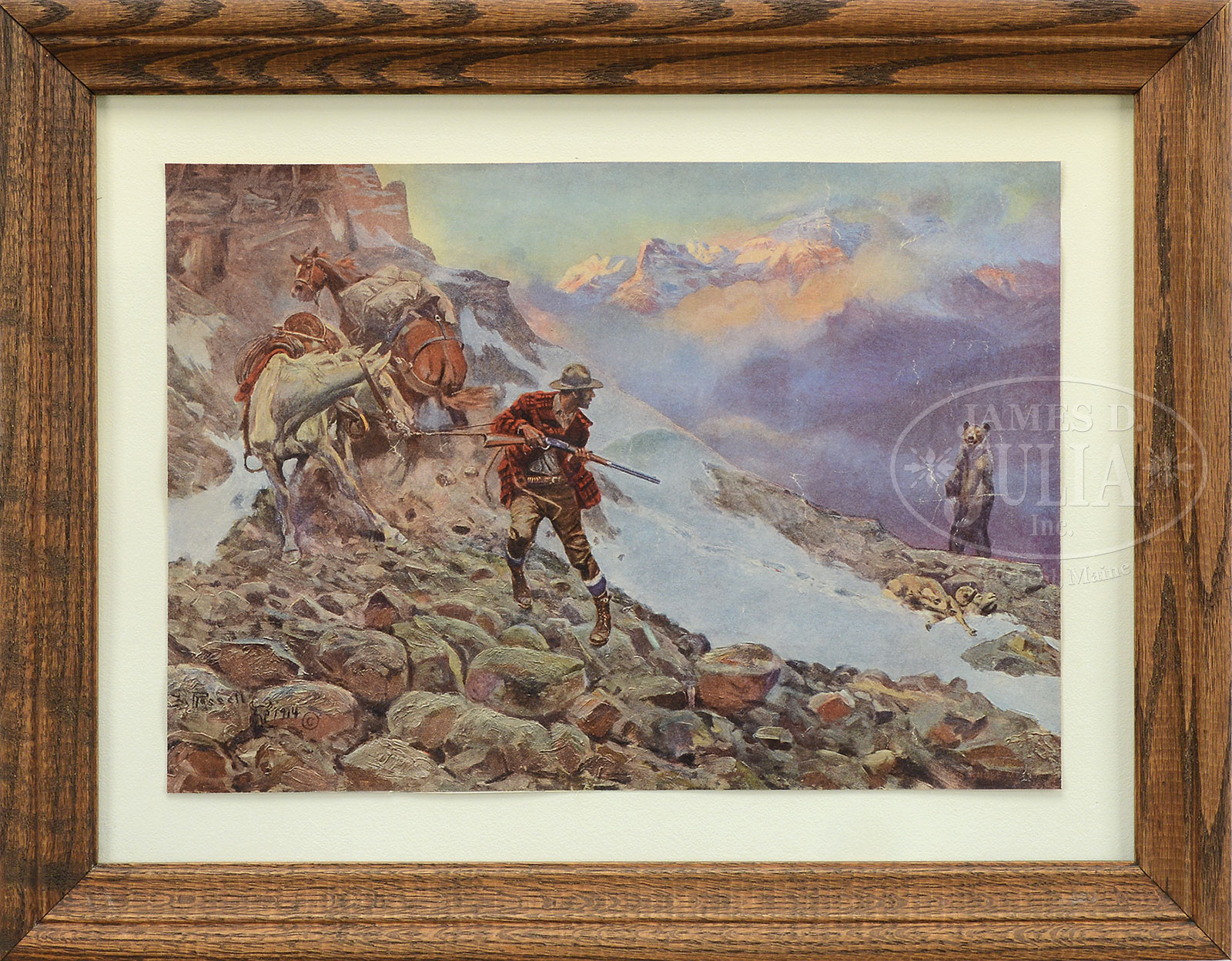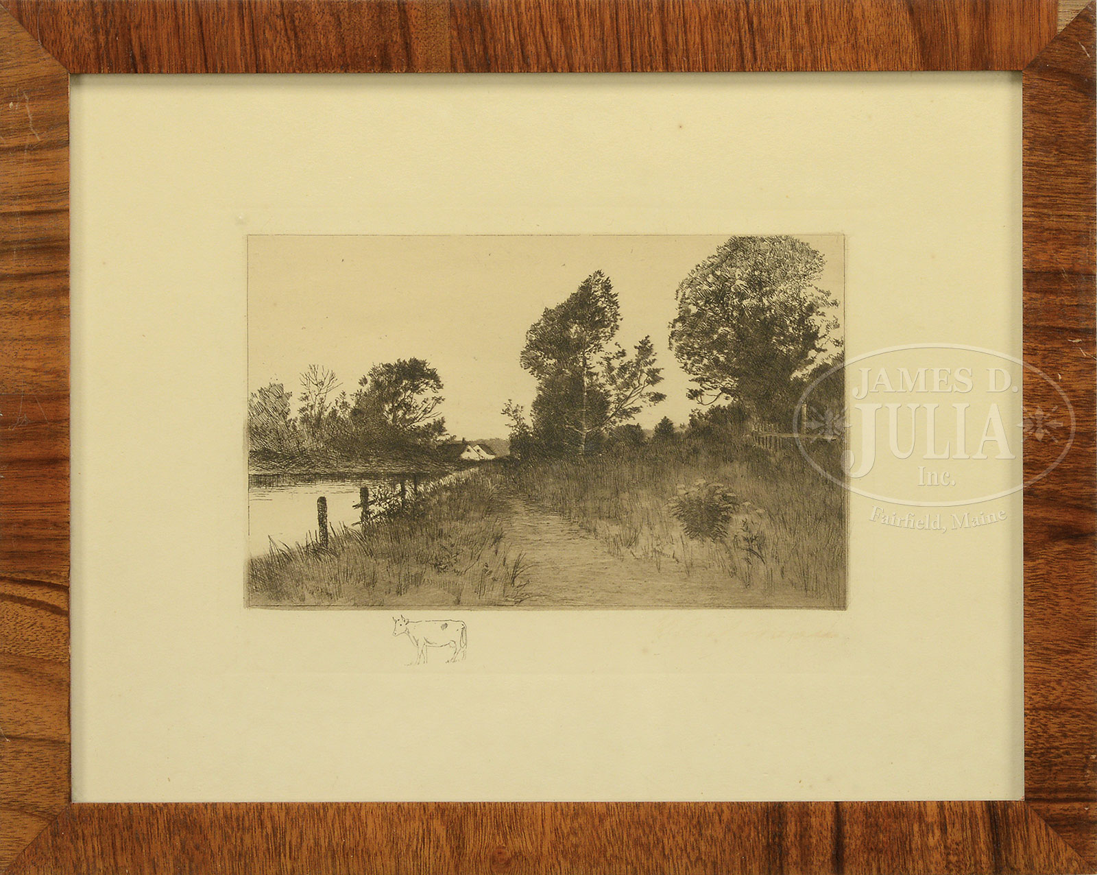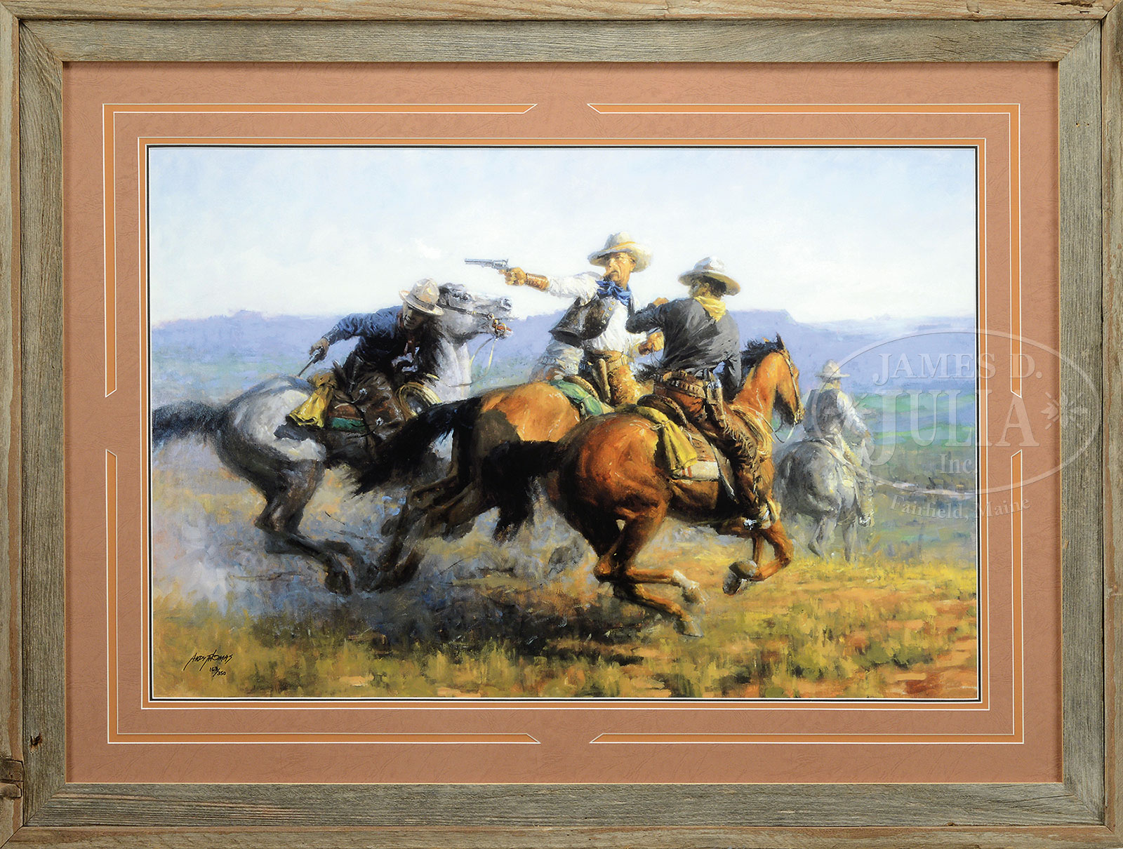 COLLECTION OF TEN AMERICAN AND EUROPEAN PRINTS.1) ANDY THOMAS, “DESPERATE RIDE”, giclee on paper, housed in a rustic wood frame, signed lower left “Andy Thomas” and numbered “163/350”, includes Certificate of Authenticity from Somerset Fine Arts, 2006; 2) ANDY THOMAS, “THE BURROW AND THE BAD MEN”, giclee on paper, housed in a rustic wood frame, signed lower right “Andy Thomas” and numbered “5/500”, includes Certificate of Authenticity from Somerset Fine Arts 2011; 3) Unknown, THE RESCUE, color poster, housed in a contemporary wood frame, unsigned; 4) AFTER RUSSELL, HUNTER AND BEAR commercial offset print, housed in a wood frame under glass; 5) AFTER N.C. WYETH “WILD BILL HICKOK AT THE CARDS”, commercial offset print from the Buffalo Bill Historic Center, housed in a contemporary wood frame; 6) WALLACE NUTTING, “A LITTLE HOMESTEAD”, hand-colored photograph, housed in a vintage wood frame under glass, signed lower right “Wallace Nutting”, titled lower left; 7) DE CROISSET, “VILLAGE BRETON”, etching with aquatint, housed in original giltwood frame, titled lower left and signed lower right; 8) LANDSCAPE, etching, housed in a vintage wood frame, indiscernible signature lower right; 9) TWO WOMEN IN LANDSCAPE, etching, housed in a vintage wood frame, indiscernible signature lower right; 10) SAILBOATS ON RIVER, initialed in plate in lower right “G.W.B.”, housed in a wood frame with molded decoration, matted under glass SIZE: 1) Sight: 19-1/2″ x 29-1/2″. Overall: 30-1/2″ x 40-1/2″; 2) Sight: 17-1/2″ x 24″. Overall: 29″ x 35″; 3) Sight: 23-1/2 x 29-1/2″. Overall: 31″ x 36″; 4) Sight: 9-1/2″ x 13-1/2″. Overall: 14-1/2″ x 18-1/2″; 5) Sight: 17-1/2″ x 22-1/2″. Overall: 19-1/4″ x 24-1/4″; 6) Sight: 7-1/4″ x 9-1/2″. Overall: 12-1/2″ x 14-1/2″; 7) Plate: 8-1/4″ x 10-1/2″. Overall: 13-1/2″ x 16″; 8) Plate: 6″ x 8-1/2″. Overall: 11-1/2″ x 14-1/2″; 9) Plate: 9″ x 11-1/2″. Overall: 15-1/2″ x 18-1/2″; 10) Plate: 10-1/4″ x 30-1/2 Overall: 20-1/2″ x 40-1/2″ PROVENANCE: Estate of Warren Buxton CONDITION: 1 & 2) Very good to excellent; 3) Very good; 4) Paper is affixed to back mat, creases; 5) Very good; 6) Paper discoloration, spotting, minor fading; 7) Good; 8) Faded signature, minor discoloration to paper; 9) Several fox marks, faded signature, minor paper discoloration; 10) Mat burn along edges, minor discoloration 51629-2 (50-100) – Lot 1644