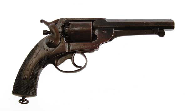 KERR DOUBLE ACTION REVOLVER. SN. 4375. Cal. .44, 5-5/8″ oct. bbl with “JS” over anchor marking on the front of the grip below the lower tang. This latter mark is assumed to be a Confederate acceptance mark. Standard markings otherwise. CONDITION: 50% blue mixed with light pitting and one patch of heavier pitting towards the muzzle on the right side. Grips are still sharp with considerable varnish at the top. Mechanically good. FS767 4-47598 (2,000-3,000)