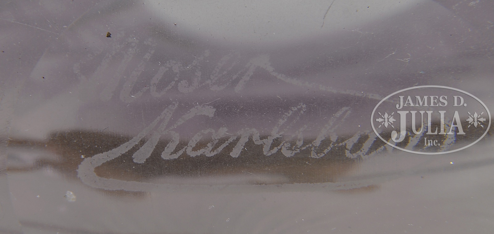 MOSER TIGER VASE.Extremely rare Moser vase has faceted sides and shades from clear to amethyst. Vase features two high relief figures of tigers standing amongst intaglio carved palm trees with a colorful applied parrot flying above. The intaglio carving surrounds the entire vase. Pictured in the book Moser Glass: The Klabin Collection by Gary D. Baldwin, pg. 28, plate 31. SIZE: 11″ t. PROVENANCE: George Klabin Collection. CONDITION: Very good with chip to parrot’s beak and tiny fleabite to tiger’s ear. 49732-1 (3,500-4,500) – Lot 1645