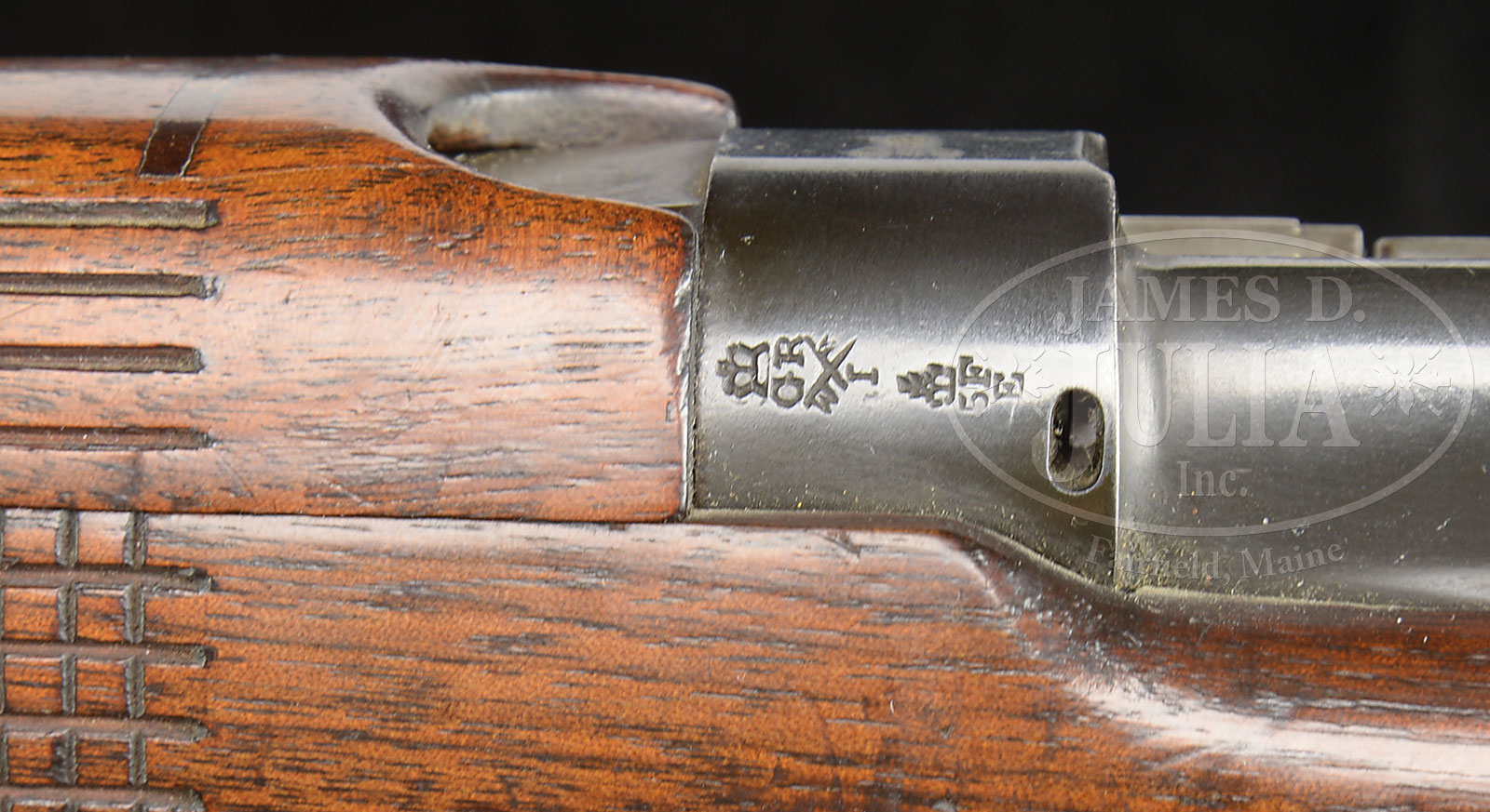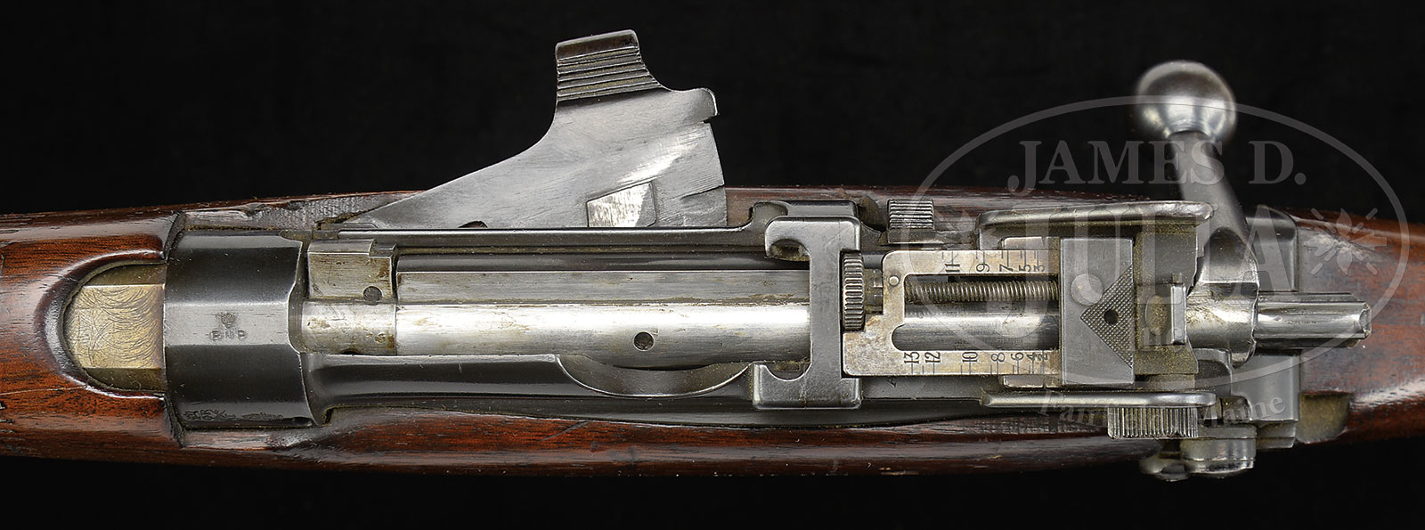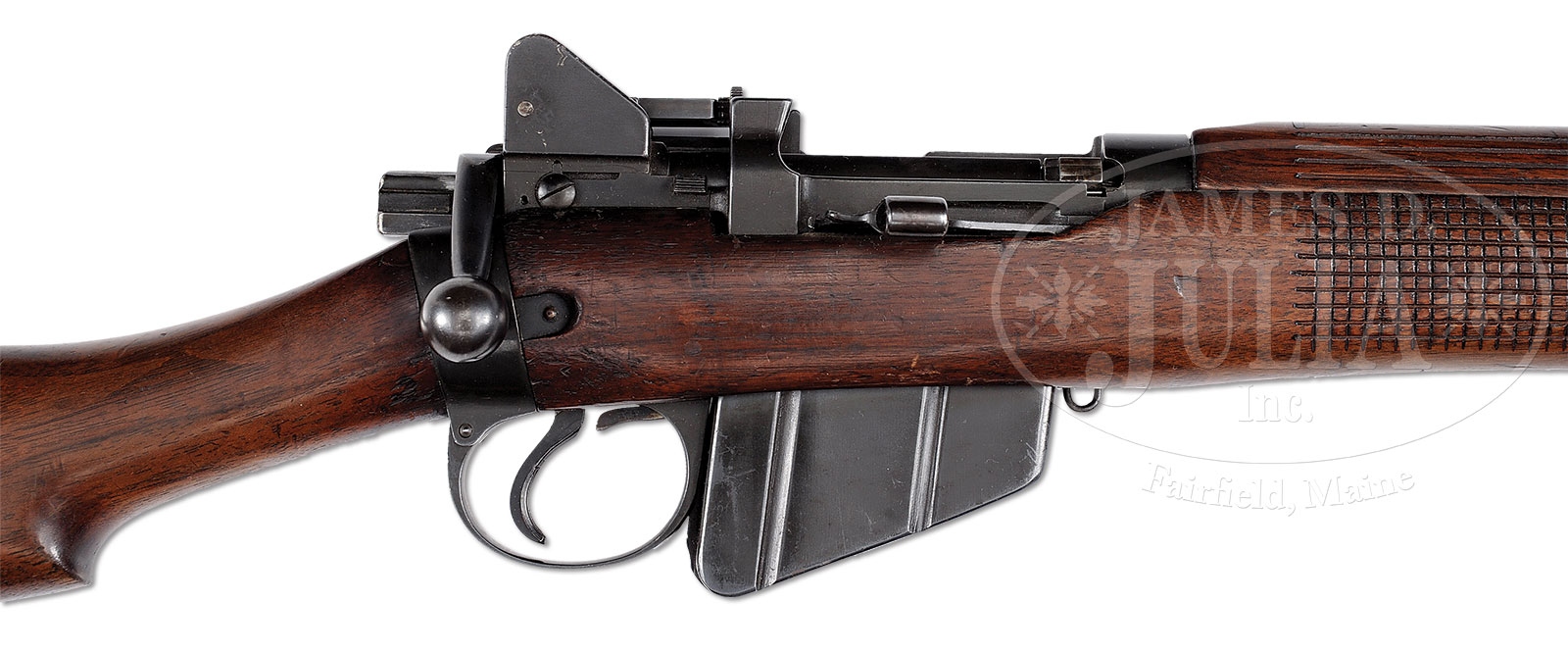 *INCREDIBLY RARE 1924 BRITISH R.S.A.F. ENFIELD .303 SMLE NO. 1 MK VI PROTOTYPE RIFLE.SN LT3101. Cal. .303. 25.2″ bbl. This rifle which is described in Skennerton’s reference, pgs 193 & 194 is the 1924 bridge between the SMLE Mk V and the Mk VI. It is immediately recognizable by the unusual nosecap, and checkered fore-wood and hand guard like ensuing Mk VI. All visible numbers matching. Trigger guard and cut off are the same tooling as Mk V. Action features are like the Mk III fitted with a Singer sewing machine safety lever. Cocking piece does not have a flange. Bolt exhibits oil holes. Reinforced protective wing rear folding sight, like later number IV. Outer band not hinged. Number IV style front sight block with screw to tighten blade. Identical bayonet lugs on each side. Upon close inspection one will not its heavy profile bbl. Formerly in the Kenyan Royal Military Academy Museum, the museum catalog number “P25” is at toe of the butt. Marked with British nitro proofs on bbl and top of receiver band. Marked “A” on butt disc, cocking piece and inside hand guards. PROVENANCE: From the Estate of World Renowned British Rifle Collector Robert W. Faris. CONDITION: Extremely fine to near excellent orig blued finish on all metal parts. Also with extremely fine wood exhibiting several dings, scratches and handling marks. Bolt also near excellent. Bore is near excellent, shiny and bright. Brass buttplate and butt disc exhibit pleasing patina. End of bbl exhibits a patinaed “straw” appearance. For the pure British rifle collector, this rifle must be seen as it is of singular importance and is the immediate predecessor of the Mk VI rifle. 51608-10 JWK (15,000-25,000) C&R – Lot 1645